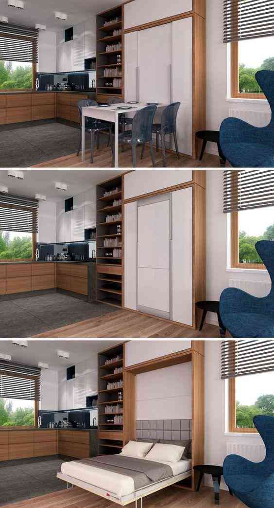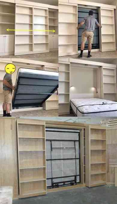 常見的翻板床都藏于柜體之中,從外表看都以為是收納柜,其實(shí)藏著一張床,不過這種存在1個(gè)缺點(diǎn),那就是犧牲柜體的收納功能來做了床鋪。