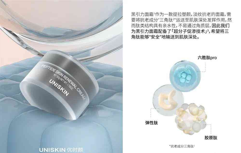 還有優(yōu)時顏推出的黑引力面霜中,據(jù)稱使用了來自深圳萱嘉生物的“超分子多肽”,在該產(chǎn)品的配方表中,除了多肽之外,還包含了甜菜堿或者肉堿等氫鍵受體。優(yōu)時顏表示,他們通過超分子滲透技術(shù)處理六勝肽、彈性肽、膠原肽三種肽類成分,將角質(zhì)層中的脂質(zhì)雙分子層“路徑拓寬”,以促進(jìn)肽類成分進(jìn)行擴(kuò)散運(yùn)輸。