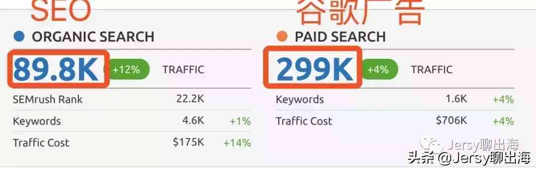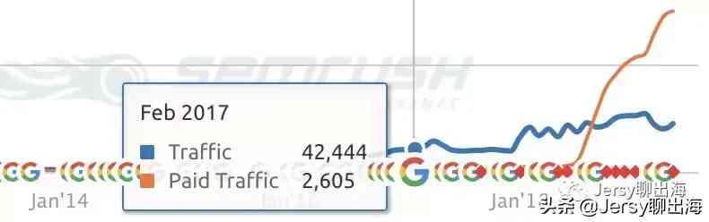 下圖為Semrush這個工具檢測到的的網(wǎng)站流量增長曲線,藍色Traffic線代表免費流量即SEO,橙色Paid Traffic線代表付費流量及谷歌廣告。