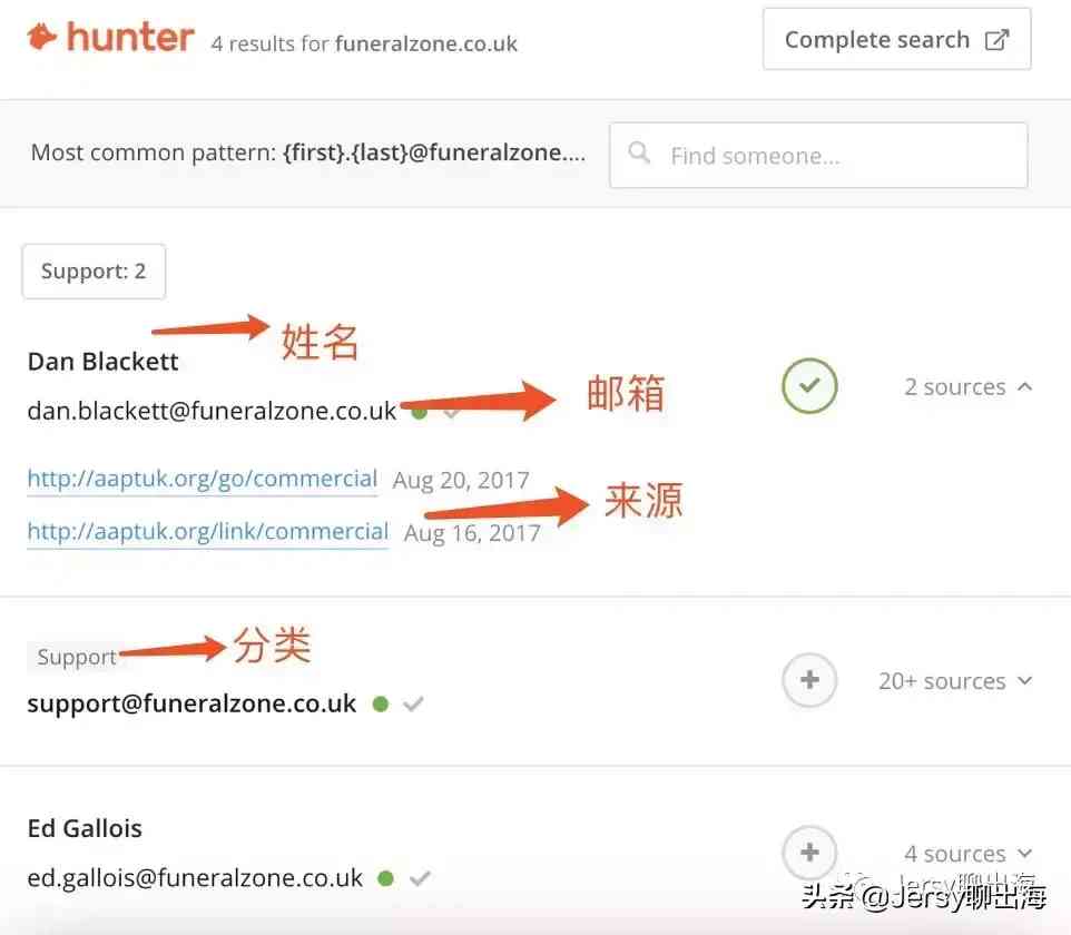 這里我們打開Hunter這個插件,他可以幫助我們自動抓取 stardust-memorials.com 上的聯(lián)系人郵箱并分類,可以看到hunter甚至將郵箱主人的姓名,來源,部門分類等信息都幫我爬取了。