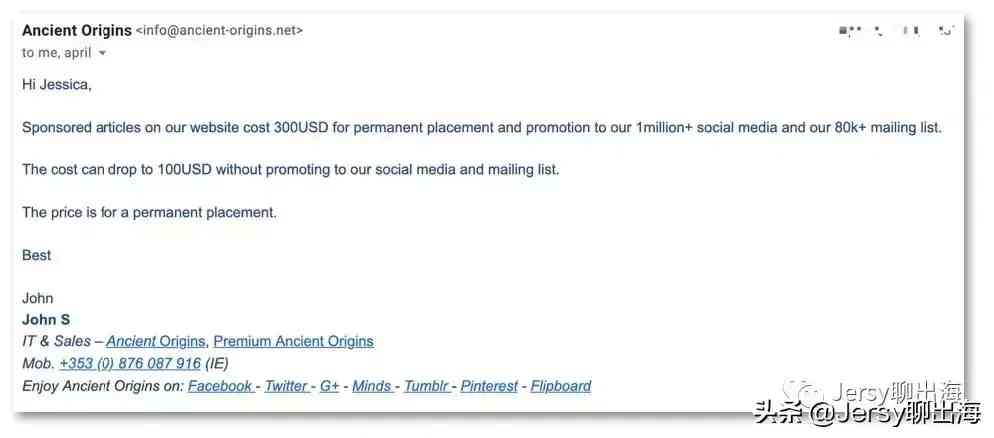 反觀ancient-origins.net這種大型網(wǎng)站,因為流量大業(yè)務(wù)廣,很多人都想去他們網(wǎng)站推廣,所以他們是很強勢的,愛來就來不來就滾。優(yōu)點是明碼標(biāo)價,缺點就是缺乏議價空間,說什么就是什么。