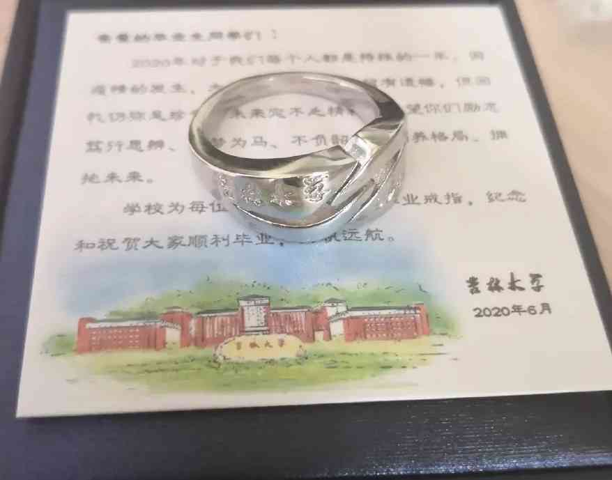 吉林大學(xué)的定制禮物非常動(dòng)人,是一枚銀色戒指,戒面一側(cè)刻著“吉林大學(xué)”四個(gè)字,另外一側(cè)則刻上了學(xué)號(hào),因此每一位畢業(yè)生的戒指都是獨(dú)一無二的。設(shè)計(jì)理念抓取吉林大學(xué)?;罩薪?jīng)典天鵝元素,兩只舞動(dòng)的天湖交互式設(shè)計(jì)在一起,擁有美好的寓意,也是勇敢、善良、睿智的象征,凸顯“趨勢創(chuàng)新,勵(lì)志圖強(qiáng)”的吉大精神。隨戒指還附帶了一張卡片,上面寫著“2020年對于我們每個(gè)人都是特殊的一年,因疫情的發(fā)生,大家的畢業(yè)季或許留有遺憾,但回憶仍彌足珍貴,未來定不乏精彩。希望你們礪志篤行思辨、以夢為馬、不負(fù)韶華、涵養(yǎng)格局、擁抱未來”。