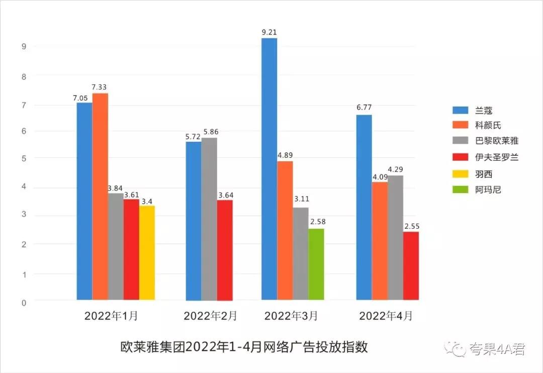 艾瑞數(shù)據(jù)顯示,歐萊雅2022網(wǎng)絡(luò)廣告投放指數(shù)高于雅詩(shī)蘭黛,1月和4月份最高,其中移動(dòng)端投放大于PC端,主推品牌蘭蔻、科顏氏、巴黎歐萊雅、伊夫圣羅蘭、阿瑪尼、羽西。如下圖: