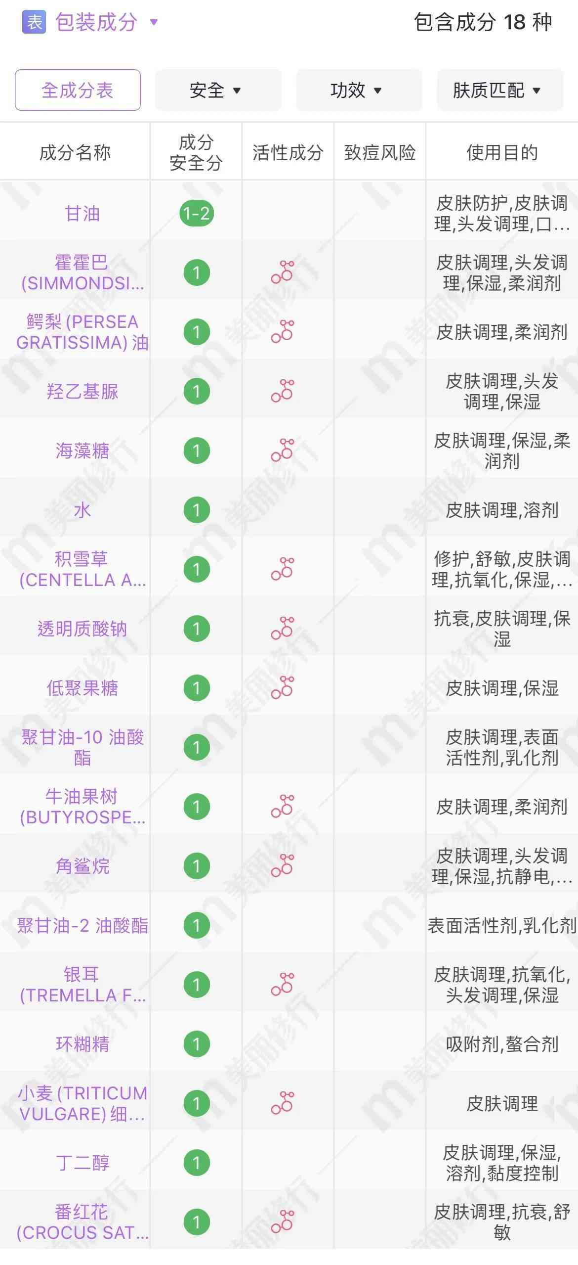 成分:甘油,丁二醇,葡聚糖等基礎(chǔ)保濕程度,功效成分霍霍巴籽油,積雪草,角鯊烯以及其他的一些植提成分。凍干的方式保留了功效型成分的活性,同時(shí)面膜也免去了防腐劑的添加。安全性-5.0分