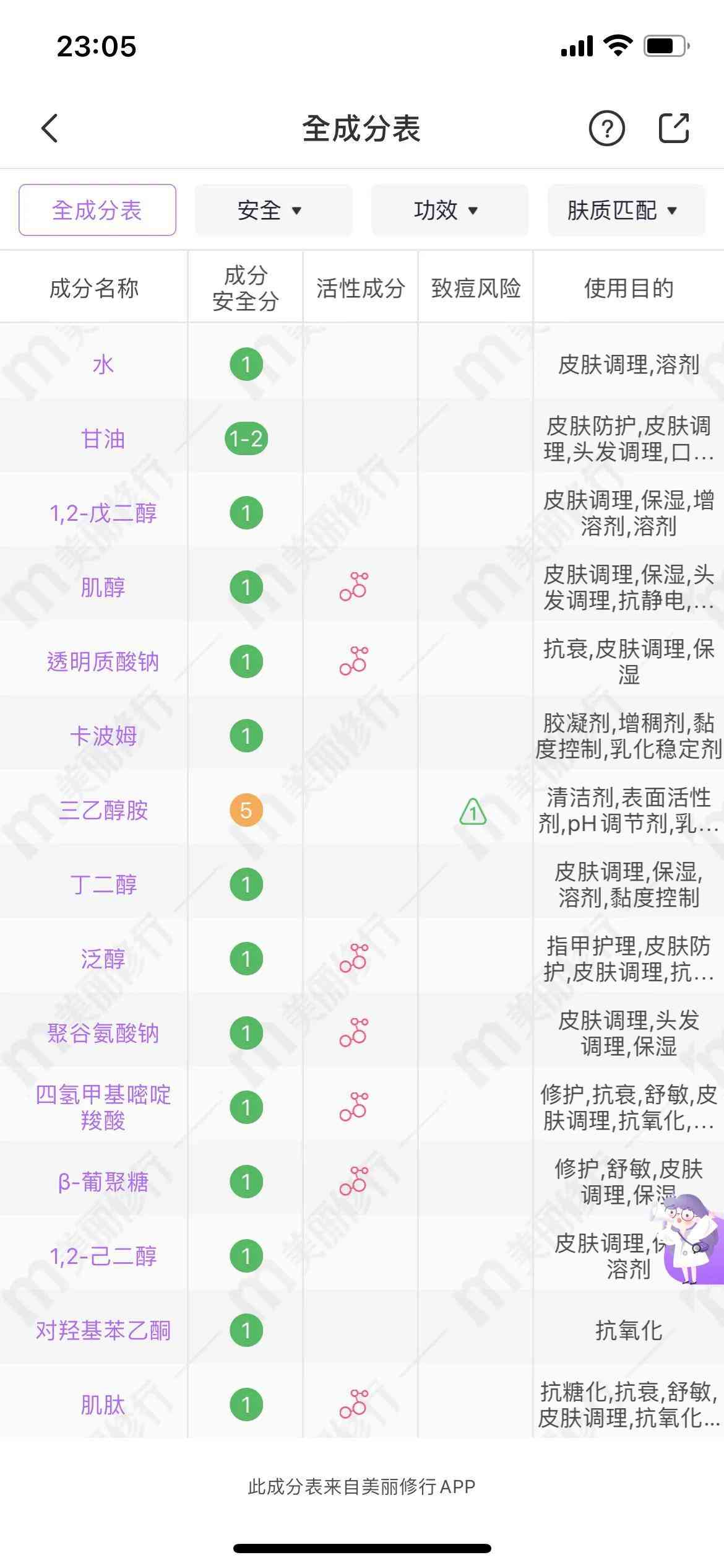 成分:械字號(hào)的產(chǎn)品不支持公開成分配方,這里不能作過多解讀,但總結(jié)下來(lái)就是:安全。含有致痘成分,三乙醇胺。安全性-4.6分