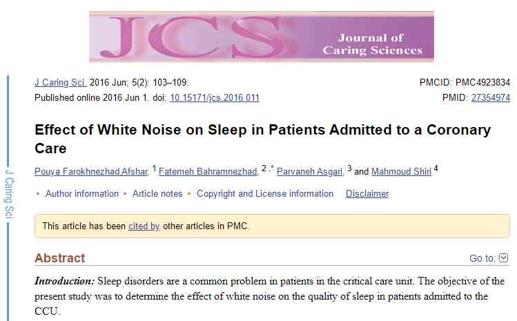 [2]AFSHAR,Pouya Farokhnezhad,et al.Effect of white noise on sleep in patients admitted to a coronary care.Journal of caring sciences,2016,5.2:103.