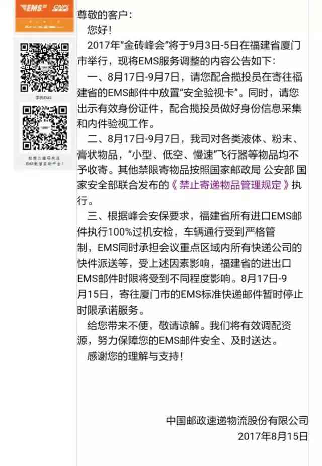 三、根據(jù)峰會(huì)安保要求,福建省所有進(jìn)口EMS郵件執(zhí)行100%過機(jī)安檢,車輛通行受到嚴(yán)格管制,EMS同時(shí)承擔(dān)會(huì)議重點(diǎn)區(qū)域內(nèi)所有快遞公司的快件派送等,受上述因素影響,福建省的進(jìn)出口EMS郵件時(shí)限將受到不同程度影響。8月17日-9月15日,寄往廈門市的EMS標(biāo)準(zhǔn)快遞郵件暫時(shí)停止時(shí)限承諾服務(wù)。
