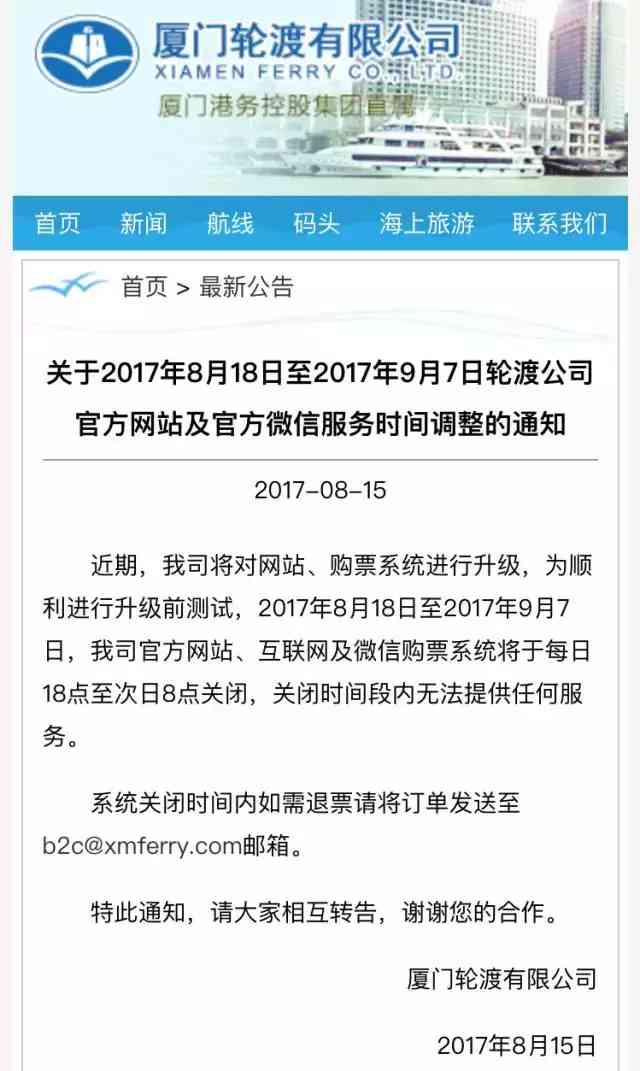輪渡公司官方網(wǎng)站及官方微信服務(wù)調(diào)整