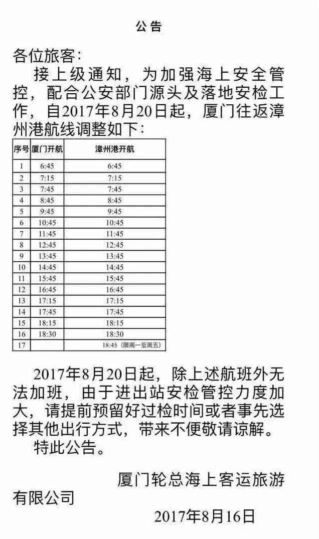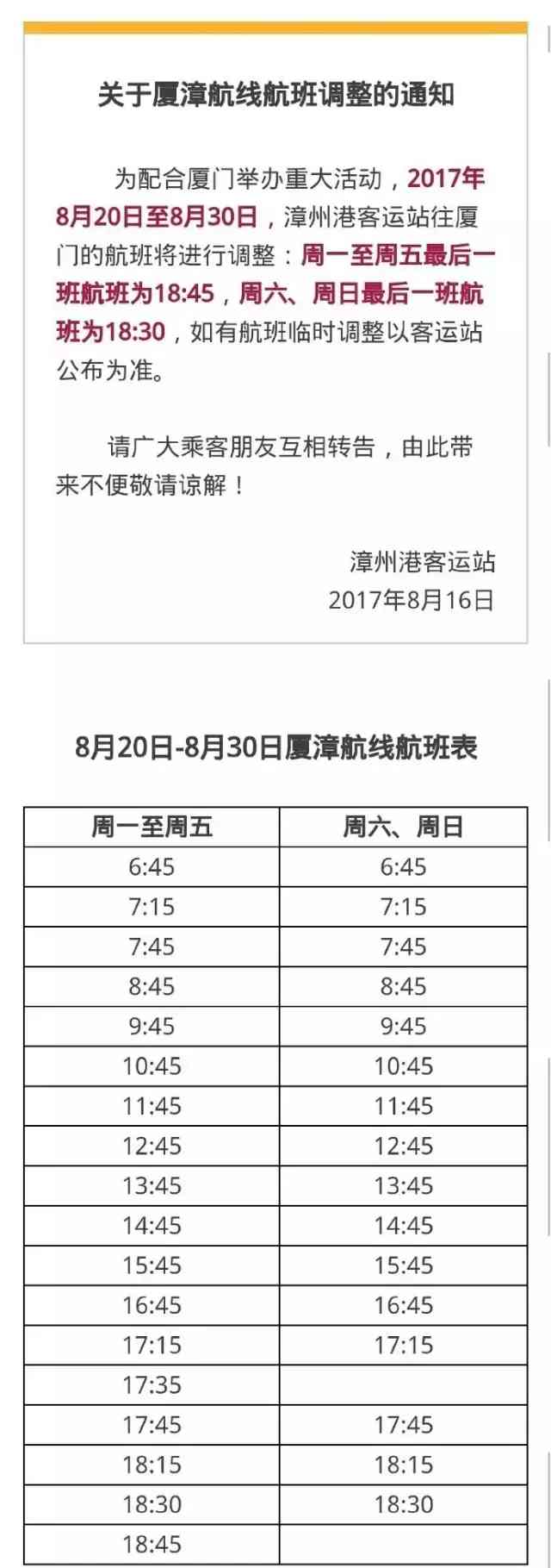 重要提醒!為配合廈門舉辦重大活動(dòng),8月20日至8月30日,漳州港往廈門的航班周一至周五最后一班航班為18:45,周六、周日最后一班航班為18:30,廈門回漳州港的航班每天最后一班均為18:30,如有航班臨時(shí)調(diào)整以客運(yùn)站公布為準(zhǔn)。
