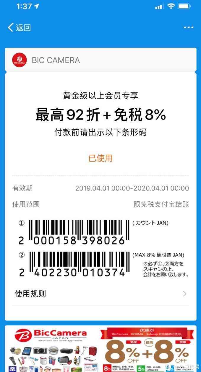 同樣的騷操作來(lái)了,首先,因?yàn)槿毡镜纳坛歉鷩?guó)內(nèi)OTA合作很成熟了,我找了攜程全球購(gòu)和支付寶等一系列平臺(tái),看看不同平臺(tái)給的BicCamera的offer,最終,在支付寶上找到了最優(yōu)的offer:8%免稅+92折!順便說(shuō)一句,目前這個(gè)券還有,有效期到2020.4.1)