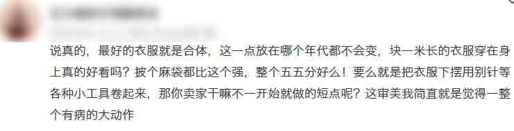 可以理解潮流對(duì)服裝的影響,但拋棄衣服本身的舒適性和合理性,把“衣服穿在人身上”,變成“把人塞進(jìn)衣服里”,顯然是本末倒置。