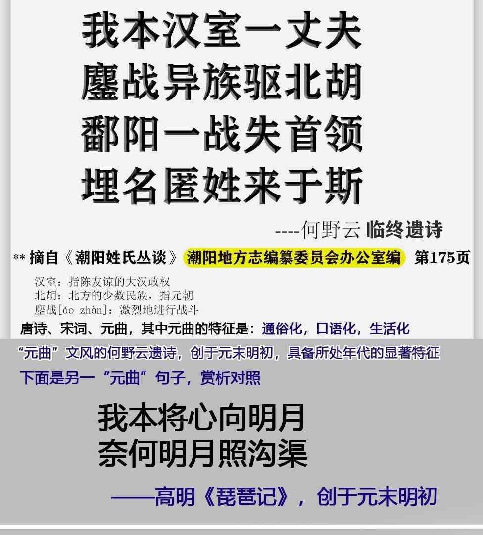 作為對(duì)照,同時(shí)代的經(jīng)典名句:“我本將心向明月,奈何明月照溝渠?!?,出自于元曲《琵琶記》,也是創(chuàng)作于元末明初。這首曲用了“我本”作為這句曲的開(kāi)頭,而何野云的遺詩(shī)也是用“我本”開(kāi)頭??梢?jiàn)他們有同時(shí)代的相似風(fēng)格。