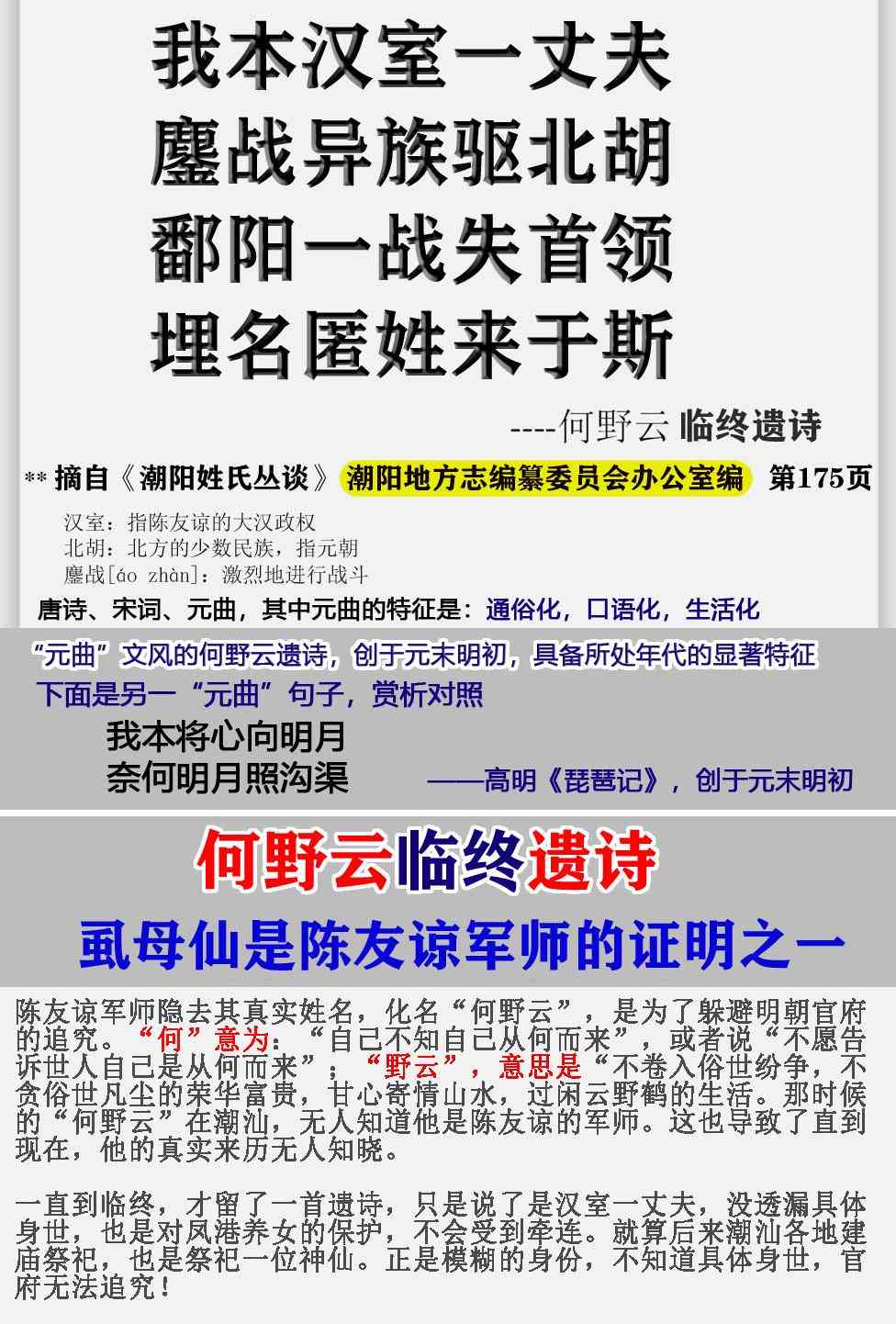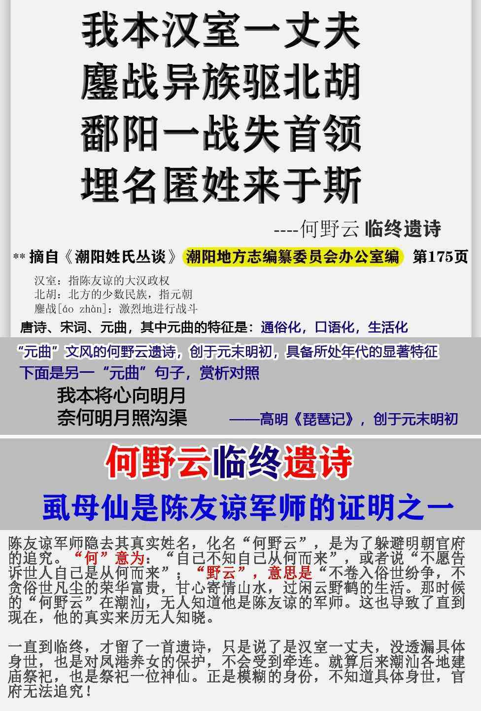 潮汕人信仰的虱母仙是明朝洪武年間陳友諒軍師化名的何野云,而不是信仰其他時(shí)代的同名同姓的其他“何野云”。