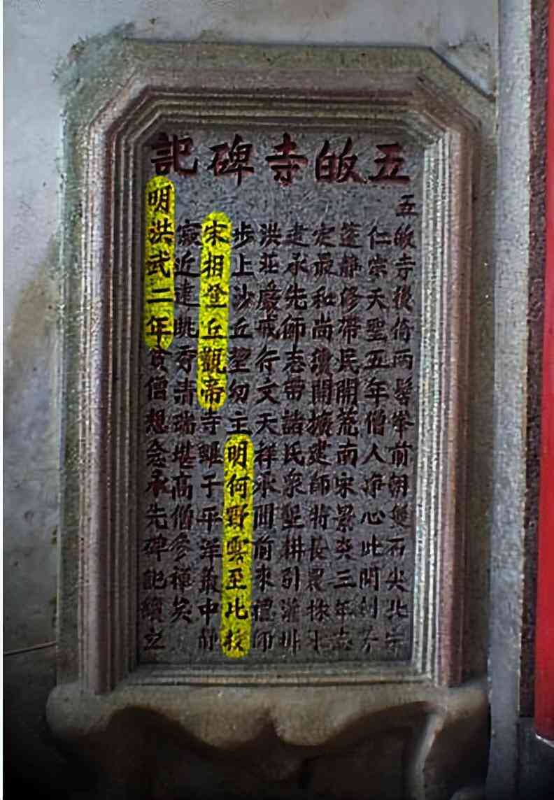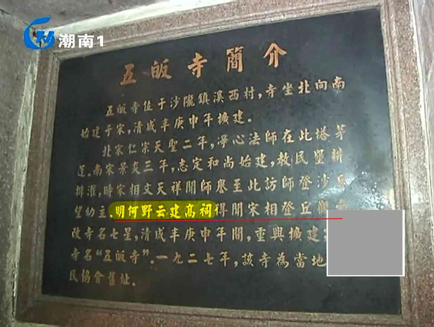 洪武一年何野云在“五皈寺”附近為高氏建祠堂,步至寺游玩,“ 五皈寺”碑刻(文物保護(hù)單位)證明洪武一年(1368年)何野云已經(jīng)在潮汕,此時(shí)何野云43歲,正值中年。而認(rèn)祖宗的人,此時(shí)14歲。