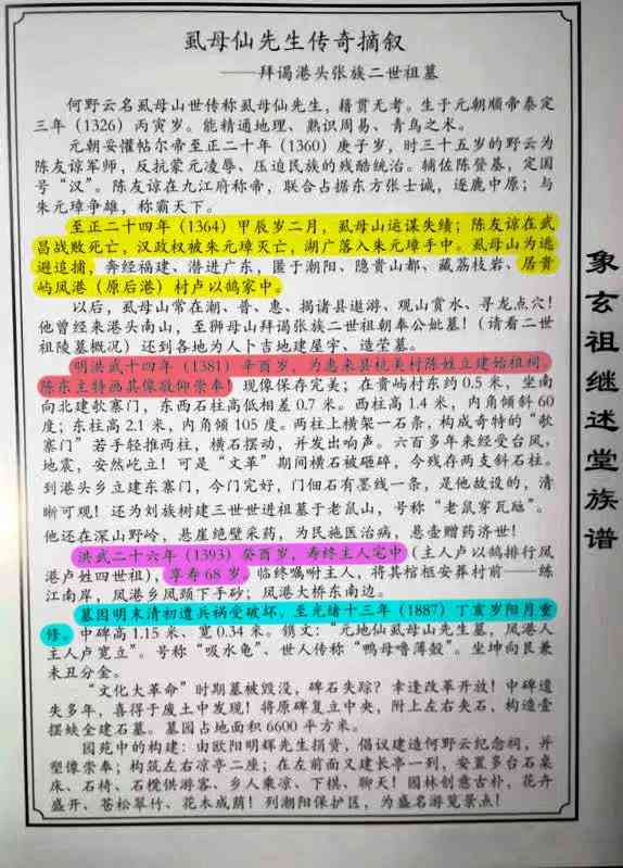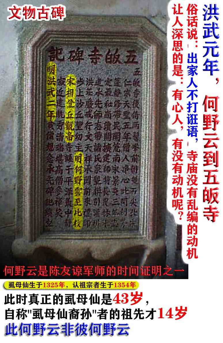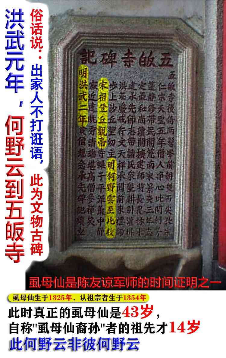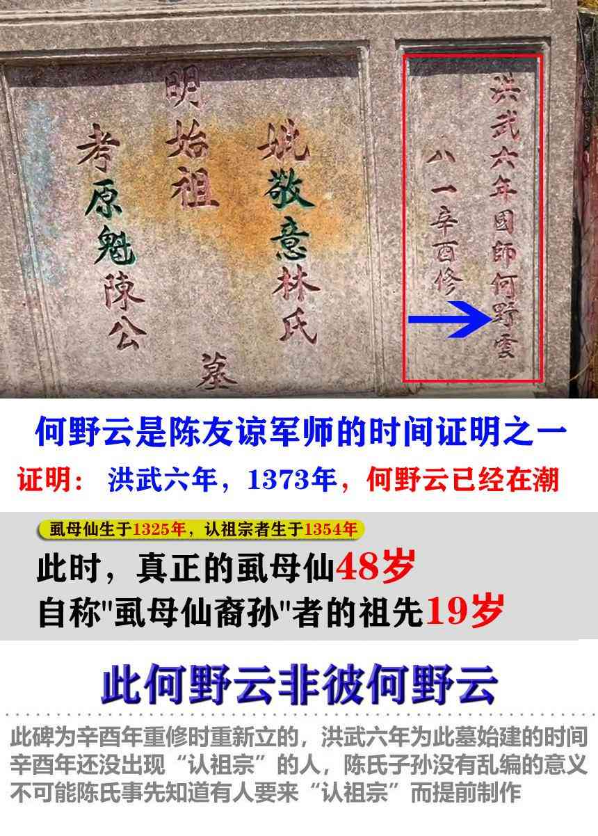 而虱母仙幫潮陽(yáng)陳氏始祖建墓在 洪武6年(1373),有碑碣為證:“洪武六年國(guó)師何野云”,虱母仙此時(shí)應(yīng)該是48歲左右。虱母仙此時(shí)應(yīng)該是51歲,而認(rèn)祖宗的人,此時(shí)19歲。