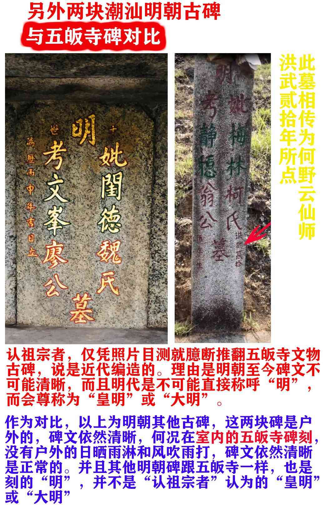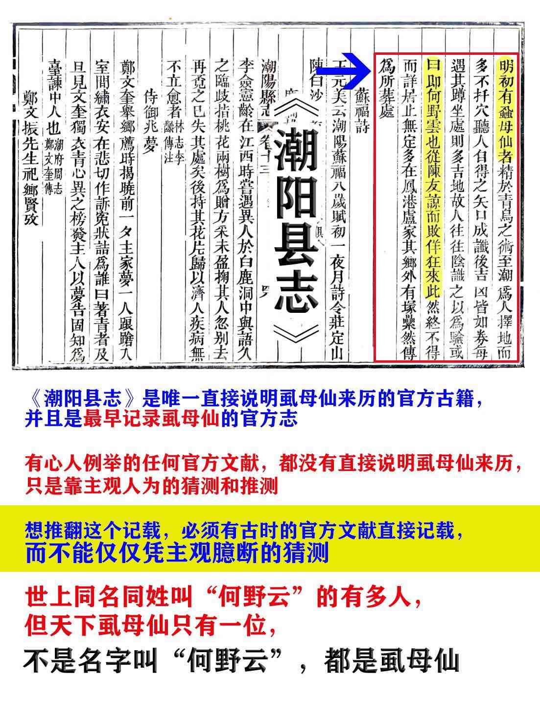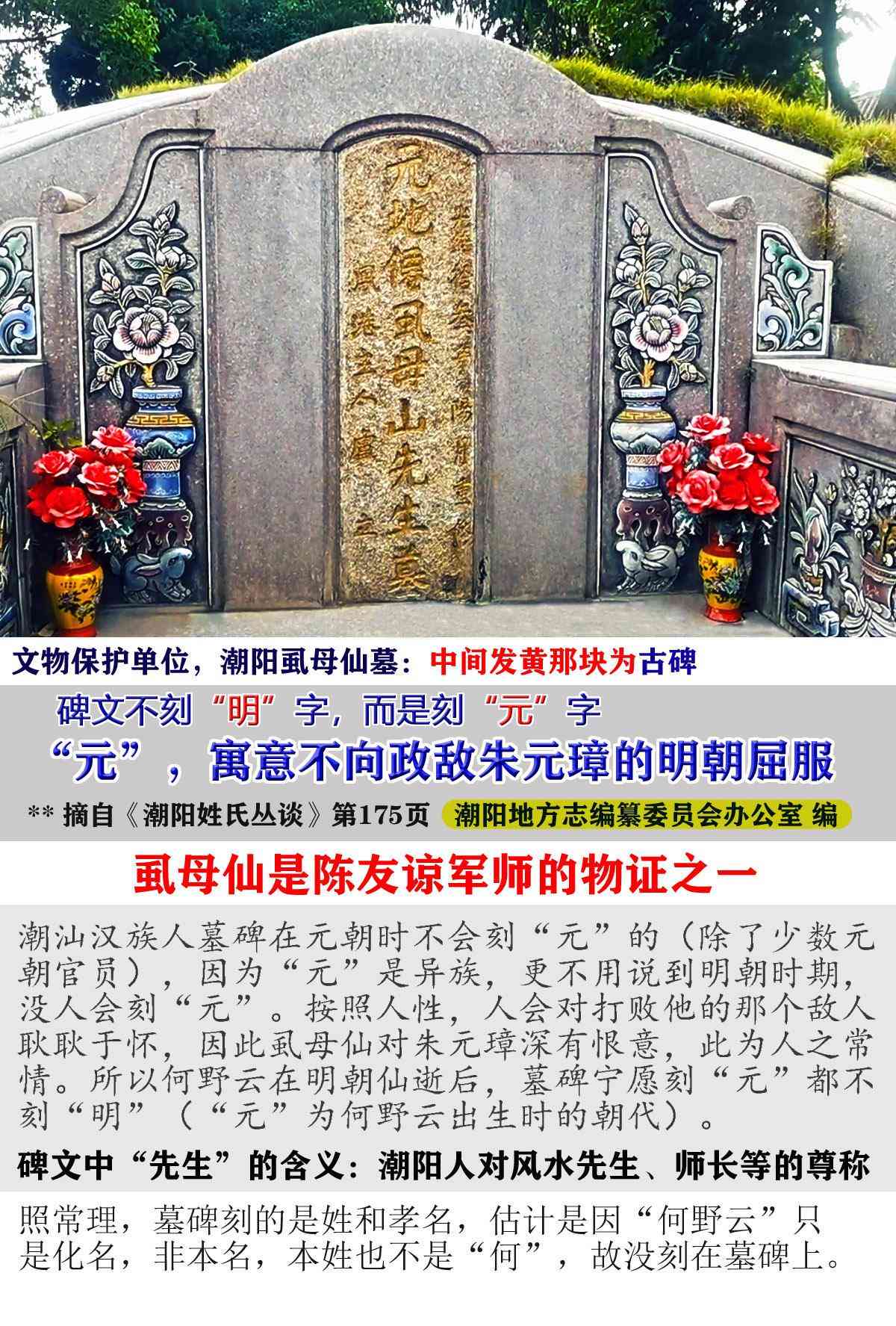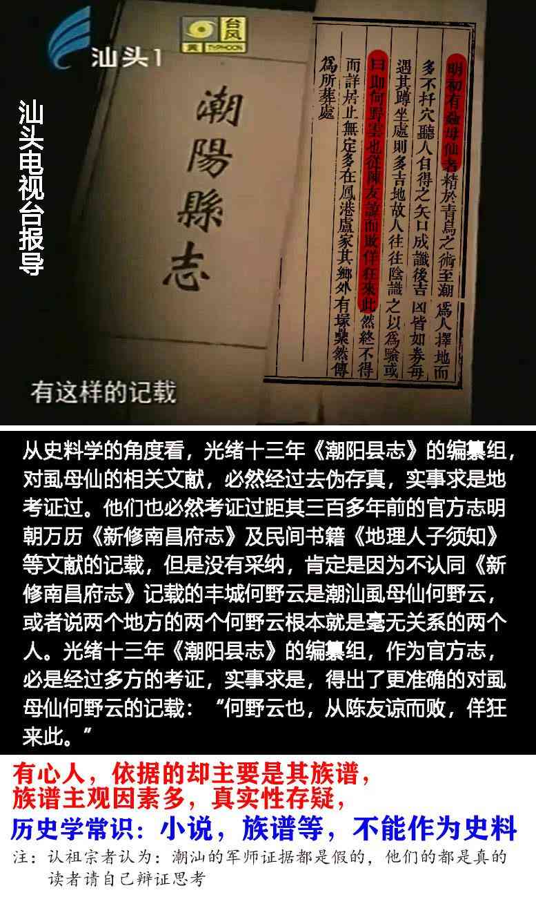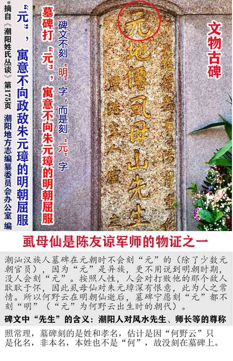 官方文獻(xiàn)《潮陽(yáng)縣志》是直接說(shuō)明何野云是從陳友諒而敗后來(lái)此,是直接證明其來(lái)歷。并且有物證:文物保護(hù)單位洪武二年(1369年)的五皈寺碑刻和文物保護(hù)單位“元”字的虱母仙古墓碑?!坝行娜恕崩e的官方文獻(xiàn)都沒(méi)有直接證明虱母仙何野云的來(lái)歷,憑牽強(qiáng)附會(huì)的猜測(cè)和推測(cè),憑無(wú)法考證真?zhèn)蔚淖遄V,是不嚴(yán)謹(jǐn)?shù)臍v史考證。可以肯定的是,不同的兩個(gè)人,此何野云非彼何野云!