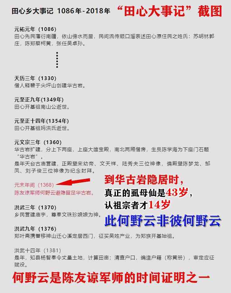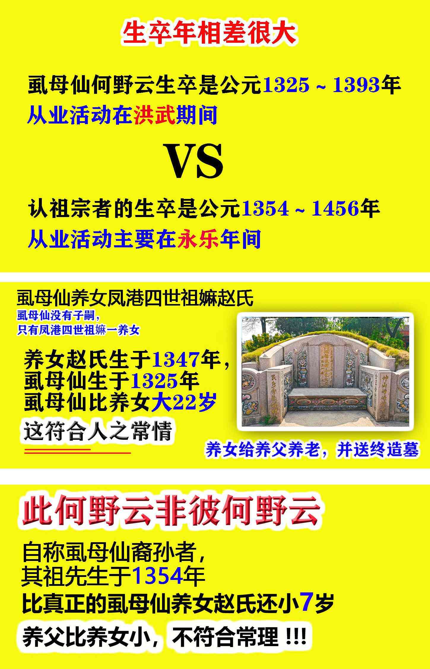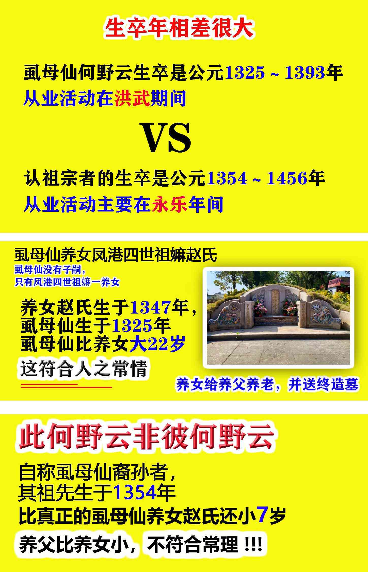 眾所周知,虱母仙沒(méi)有子嗣,只有一養(yǎng)女,即鳳港四世祖嫲趙氏,養(yǎng)女給養(yǎng)父養(yǎng)老,并送終造墓,這是符合人之常情的。虱母仙的養(yǎng)女趙氏生于1347年,養(yǎng)女比虱母仙小22歲。這符合人之常理。但是認(rèn)祖宗者卻比養(yǎng)女趙氏還小7歲,這不合常理,養(yǎng)父不可能比養(yǎng)女小。這說(shuō)明:虱母仙與認(rèn)祖宗者是不同的兩個(gè)人,此何野云非彼何野云。