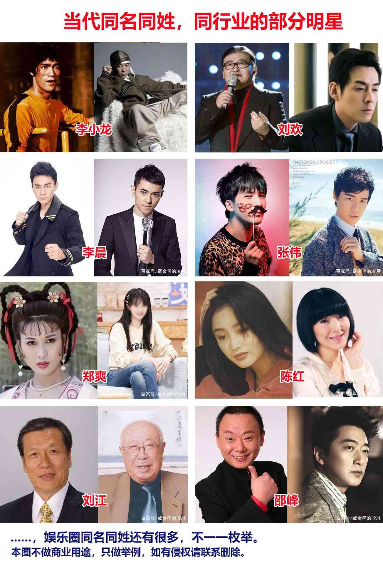 同一個(gè)時(shí)代,同一個(gè)行業(yè),會(huì)有不少同名同姓的人,下圖例舉小部分當(dāng)代同名同姓的明星。網(wǎng)絡(luò)搜索,會(huì)發(fā)現(xiàn)同行業(yè)同名同姓的很多。而如果時(shí)間范圍擴(kuò)展到不同時(shí)代,同名同姓的人會(huì)更多。