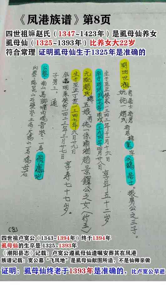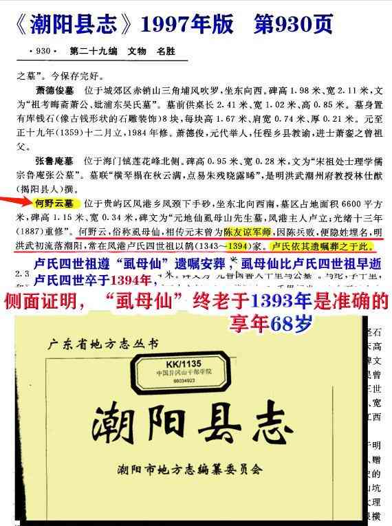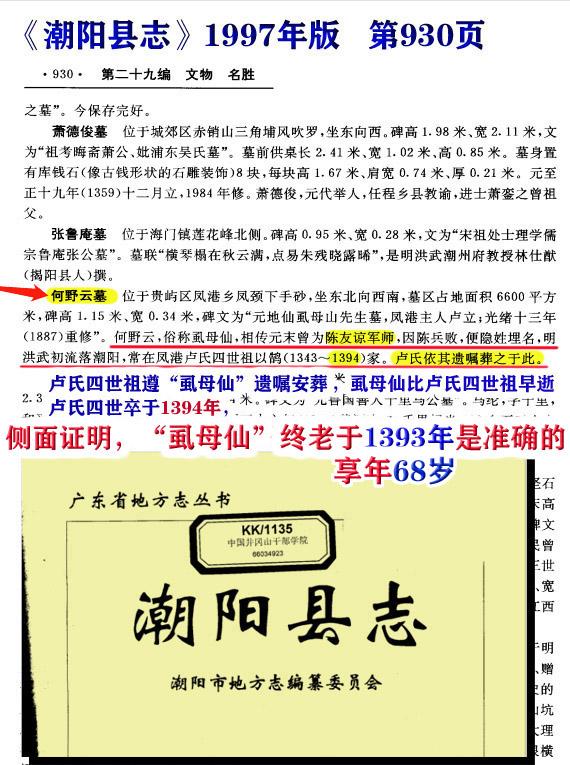 官方志書(shū)《潮陽(yáng)縣志》1997年版 第930頁(yè) 有記載:鳳港盧氏四世祖依“虱母仙”遺囑安葬仙師,據(jù)此可知“虱母仙”比鳳港盧氏四世祖公早逝。而鳳港盧氏四世祖公卒于1394年,證明:“虱母仙”終老于1393年是準(zhǔn)確的,享年68歲。