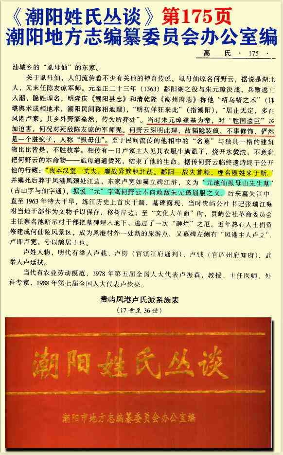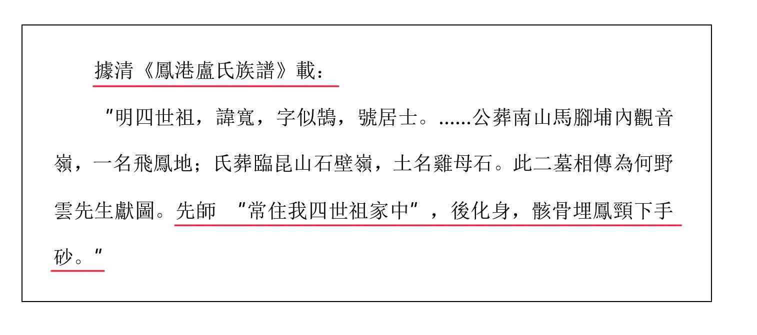 從四世祖嫲和祖公的生卒年的記載,還有葬地的記載,可以看出《鳳港盧氏族譜》是實(shí)事求是的記載的。所以對(duì)于何野云的記載,也必然是實(shí)事求是的。