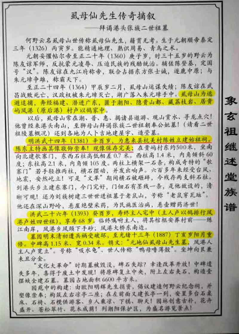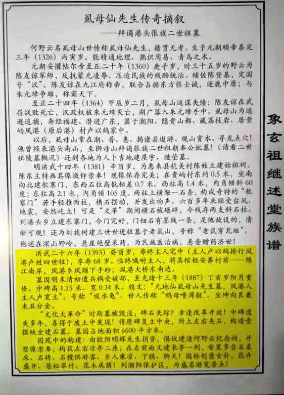 從上面的分析已知曉,洪武年間(1368-1393年)的何野云各種事跡,實(shí)際就是陳友諒軍師化名的“何野云”的活動(dòng)事跡。除了官方的文獻(xiàn)有何野云在潮活動(dòng)的記載,非官方的,如臚崗鎮(zhèn)港頭《張氏族譜》和一些書(shū)籍也有類(lèi)似的記載,何野云曾經(jīng)去拜謁參觀港頭二世祖墓。所以張氏族譜記載了何野云這個(gè)事跡,并且記載了何野云的生卒、生平簡(jiǎn)介,還有何野云墓。