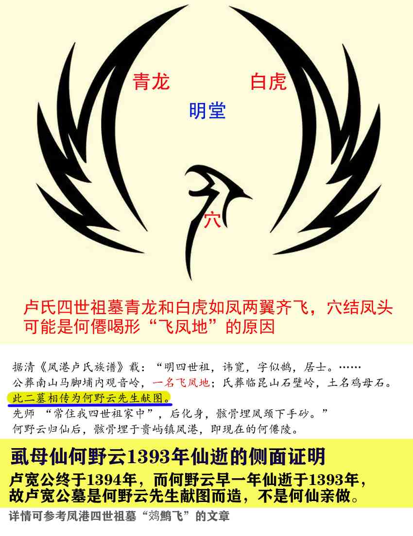 據(jù)清《鳳港盧氏族譜》載:“明四世祖,諱寬,字似鵠,號(hào)居士。寬公為鳳港四世祖。生于元朝至正癸未,卒于明朝洪武廿七年甲戍,即公元(1343年一1394年),公葬南山馬腳埔內(nèi)觀音嶺(現(xiàn)兩英鎮(zhèn)新寮門(mén)村后,座坤向艮),一名飛鳳地,此墓相傳何諱野云先生獻(xiàn)圖?!?。依據(jù)《鳳港盧氏族譜》可知,盧寬公終于1394年,而何野云早一年仙逝于1393年(盧氏安葬何仙骸骨于鳳港鳳頸下手砂,即現(xiàn)在的何僊陵),而盧寬公墓是何野云先生獻(xiàn)圖而造,不是何仙親做。