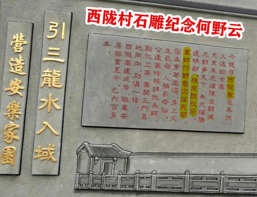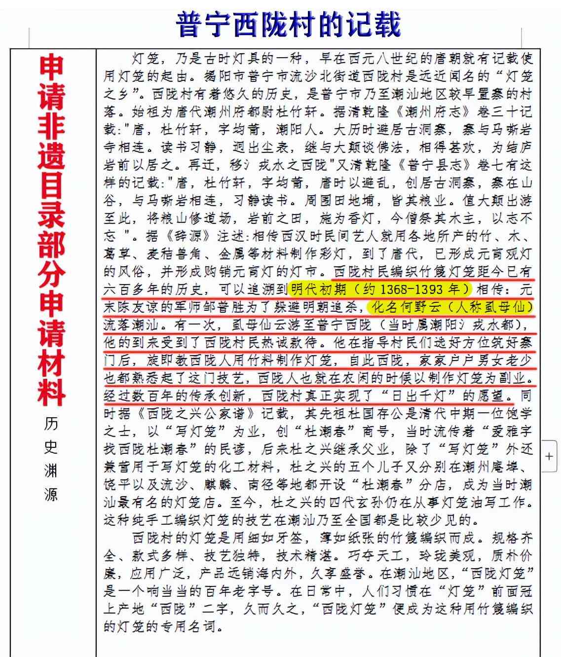 由西隴申請(qǐng)非遺的材料,我們可以知道,西隴村對(duì)虱母仙何野云的記載,時(shí)間也是明朝洪武初,即約1368-1393年間,陳友諒軍師為了躲避明朝追殺,化名“何野云”,流落到此。作為一個(gè)歷史悠久的古村落,西隴村對(duì)于虱母仙何野云的記載,必然是客觀的的。這也證明了,《潮陽(yáng)縣志》和其他各村的族譜,對(duì)于陳友諒軍師何野云的記載,是一致的。