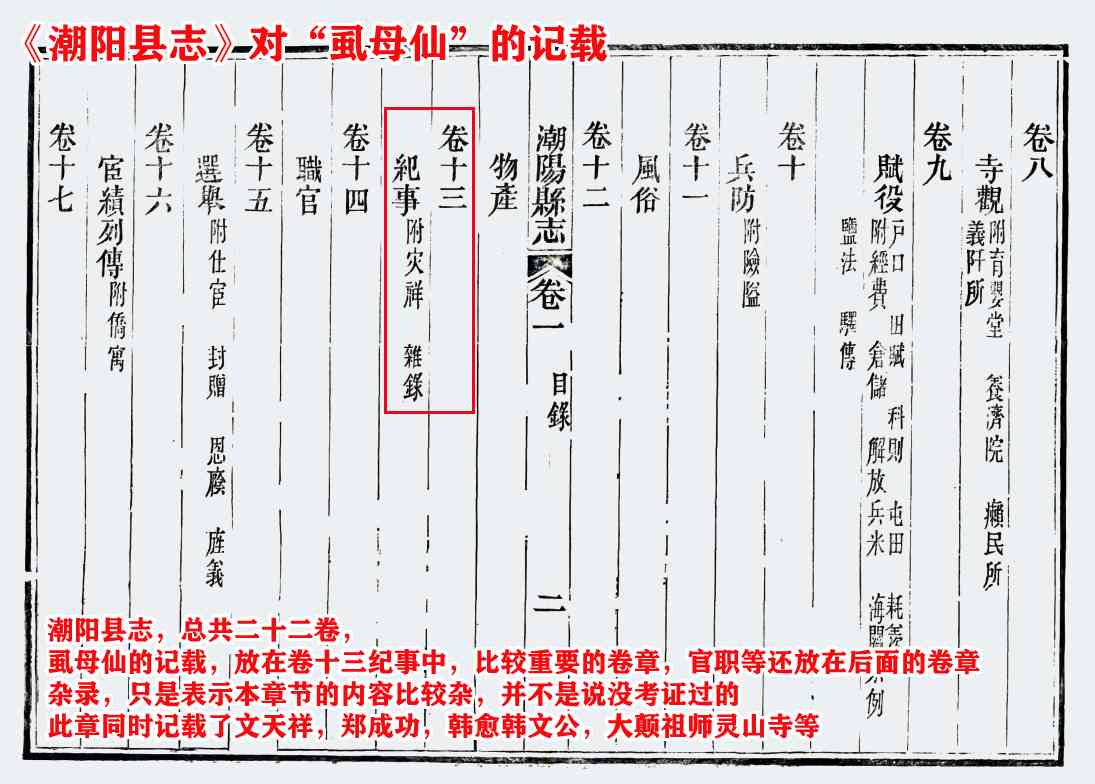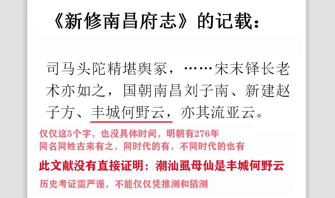 有的人例舉了《新修南昌府志》的記載:“司馬頭陀精堪輿冢,……宋末鐸長(zhǎng)老術(shù)亦如之,國(guó)朝南昌劉子南、新建趙子方、豐城何野云,亦其流亞云?!边@里出現(xiàn)了“豐城何野云”這五個(gè)字,只能證明歷史上豐城有何野云這個(gè)人,但是這個(gè)府志并沒(méi)有說(shuō)潮汕虱母仙何野云是豐城何野云。