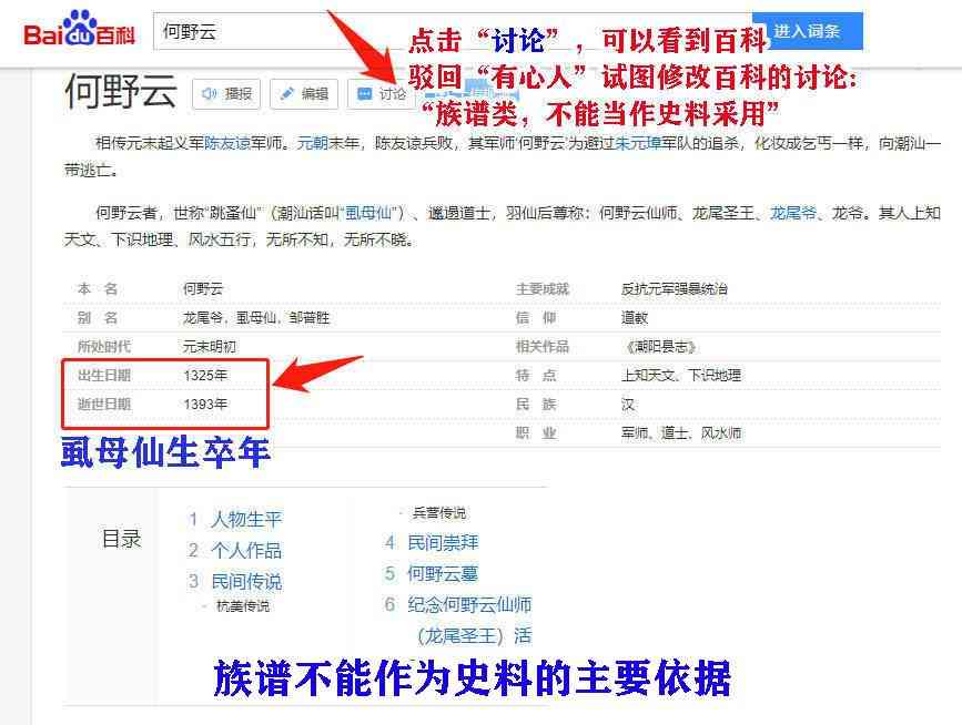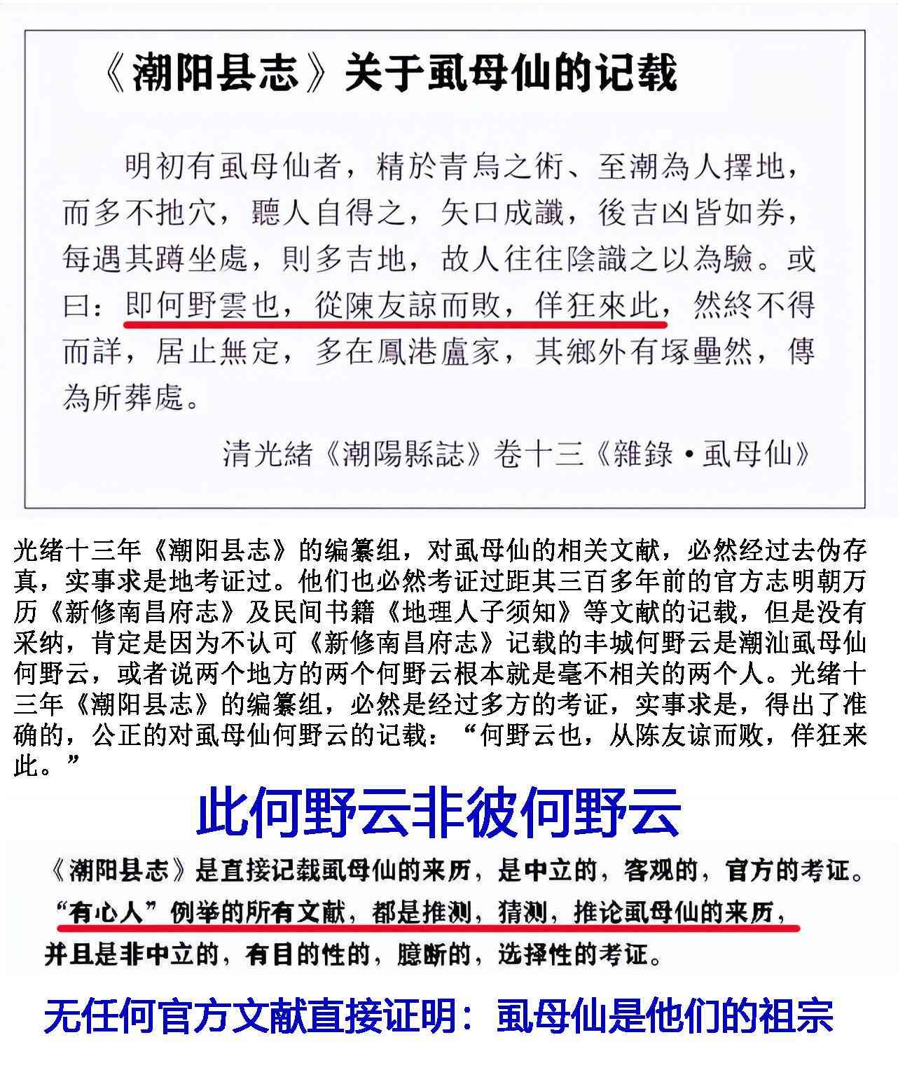 認(rèn)祖宗的人宣稱(chēng)這些文獻(xiàn)記載了有個(gè)名叫“何野云”的人家鄉(xiāng)在哪里,但是沒(méi)有記載具體時(shí)間,到底是明初,明中,還是明末呢?是不是同一個(gè)時(shí)代的何野云呢?同名同姓古來(lái)有之,同一個(gè)時(shí)代有很多同名同姓的人;更不用說(shuō)不同時(shí)代,有多少個(gè)名字是“何野云”的人了。他們例舉的文獻(xiàn),只能證明:曾經(jīng)有個(gè)名“何野云”的人,在他們那里。但是沒(méi)有任何官方文獻(xiàn)直接證明:潮汕虱母仙的故鄉(xiāng)是他們那里。也沒(méi)有任何官方文獻(xiàn)直接證明:潮汕虱母仙是他們的那個(gè)“何野云”。此何野云是彼何野云嗎?明顯是擦邊球行為。