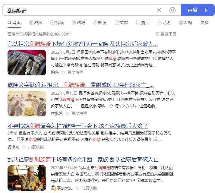 網(wǎng)絡(luò)上關(guān)于“亂認(rèn)祖宗,亂編族譜”的文章很多,古來(lái)有之,有些人攀附成風(fēng),有些家譜更是肆意認(rèn)祖,甚至按照推演,這種攀附風(fēng)氣受到了乾隆的高度關(guān)注,嚴(yán)令整頓家譜編纂的號(hào)令便就此鋪設(shè)下去,要求各地督撫嚴(yán)查家譜中的僭越情況,更就此限制了各地普遍進(jìn)行的修譜情況。上諭下來(lái),糾察行動(dòng)轟轟烈烈。