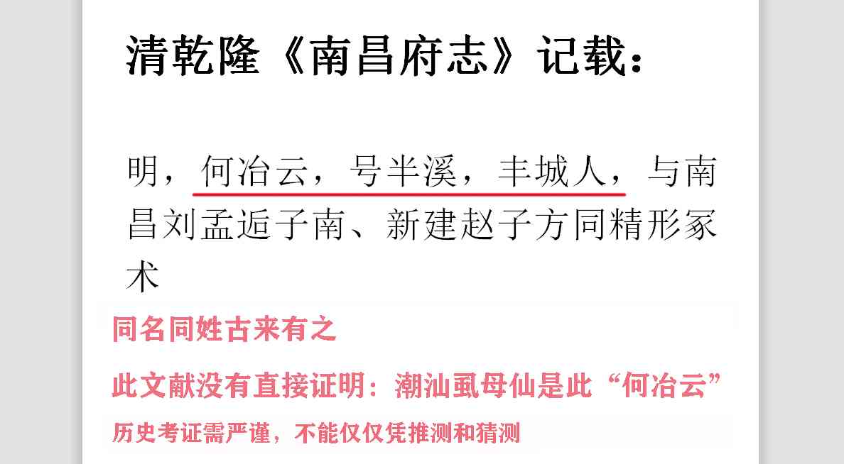 還有他們例舉了清乾隆《南昌府志》記載:“明,何冶云,號(hào)半溪,豐城人,與南昌劉孟逅子南、新建趙子方同精形冢術(shù)”,這里同樣,沒(méi)有記載潮汕虱母仙何野云是豐城何野云,只是記載明朝有個(gè)“何冶云”是豐城人。他們認(rèn)為“何冶云”跟“何野云”同音,應(yīng)該是“野”被錯(cuò)寫(xiě)成“冶”字了?!昂我痹坪汀昂我霸啤薄钡降资遣皇峭粋€(gè)人,我們不得而知。