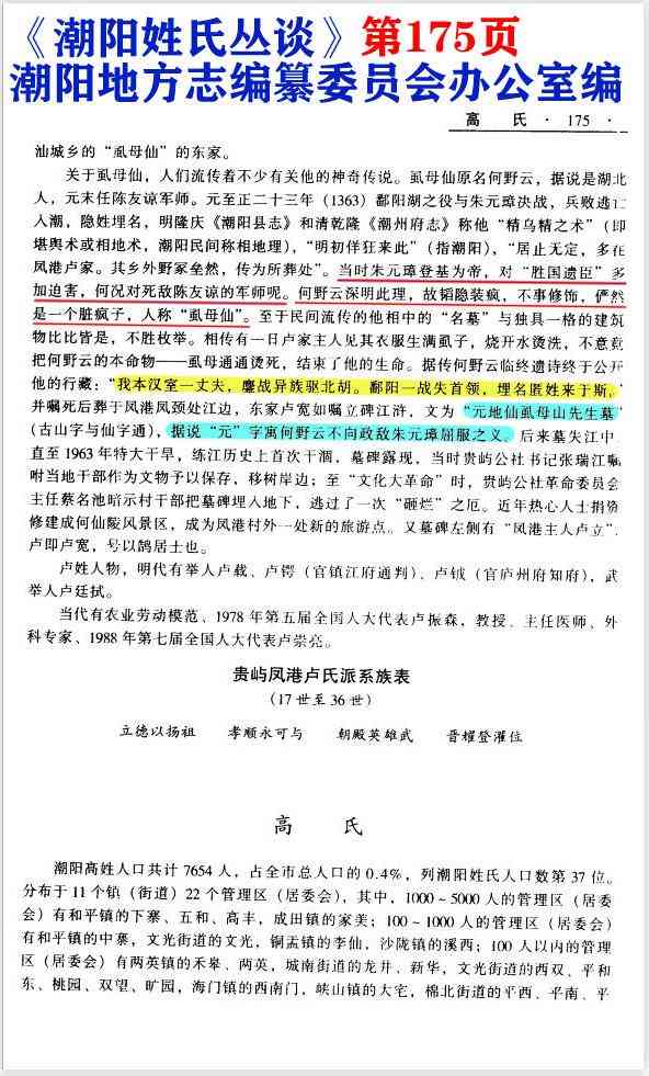 官方志書(shū)《潮汕縣志》是直接記載虱母仙從陳友諒而敗,佯狂來(lái)此,直接證明虱母仙的來(lái)歷。而“有心人”例舉的其他各種官方志,都沒(méi)有能直接證明虱母仙來(lái)歷的,他們僅僅憑的是牽強(qiáng)附會(huì)的推測(cè)和猜測(cè),這是不嚴(yán)謹(jǐn)?shù)?,不可信的?span style="color: #191919">可以肯定的是,不同的兩個(gè)人,此何野云非彼何野云!