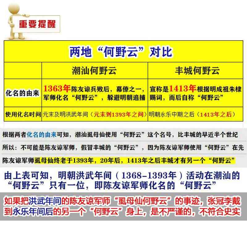 根據(jù)兩者化名的由來(lái)可知,陳友諒軍師使用“何野云”這個(gè)名號(hào),比豐城的早近半個(gè)世紀(jì)。直到陳友諒軍師虱母仙在1393年終老,過(guò)20年后,1413年后豐城才有另一個(gè)“何野云”。換句話(huà)說(shuō),潮汕在明朝洪武年間,1368-1393年間的何野云,只有一位,即陳友諒軍師化名的“何野云”。因?yàn)樨S城的是明朝永樂(lè)1413年之后才使用“何野云”這個(gè)名字。據(jù)此可知,他們是不同的兩個(gè)人,此何野云非彼何野云。