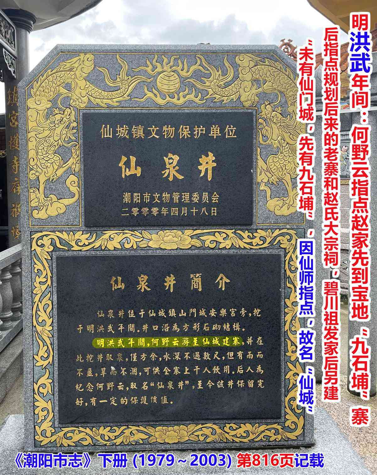 明朝洪武年間,何野云仙師指點(diǎn)仙門(mén)城趙氏建寨并掘地取泉、指點(diǎn)規(guī)劃后來(lái)的老寨和大宗祠、遷葬始祖墓、安葬二世祖墓、指點(diǎn)三世祖生基。