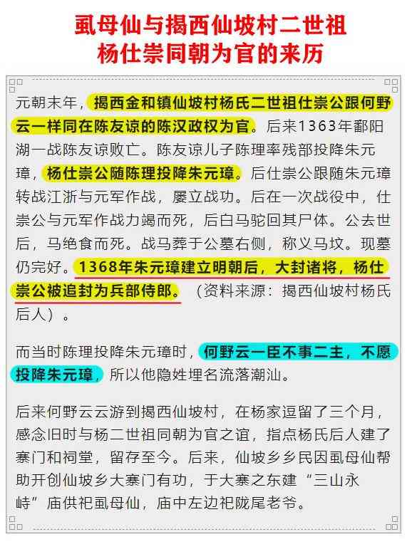 公元1360年,何野云事助陳友諒,揭西金和鎮(zhèn)仙坡村楊氏二世祖仕崇公跟何野云一樣同在陳友諒的陳漢政權(quán)為官。這就是何野云與楊仕崇公同朝為官的來(lái)歷。后來(lái)1363年鄱陽(yáng)湖一戰(zhàn)陳友諒敗亡。陳友諒兒子陳理率殘部投降朱元璋,楊仕崇公隨陳理投降朱元璋。后仕崇公跟隨朱元璋轉(zhuǎn)戰(zhàn)江浙與元軍作戰(zhàn),屢立戰(zhàn)功。后在一次戰(zhàn)役中,仕崇公與元軍作戰(zhàn)力竭而死,后白馬駝回其尸體。公去世后,馬絕食而死。戰(zhàn)馬葬于公墓右側(cè),稱(chēng)義馬墳。現(xiàn)墓仍完好。1368年朱元璋建立明朝后,大封諸將,楊仕崇公被追封為兵部侍郎。(資料來(lái)源:揭西仙坡村楊氏后人)。
