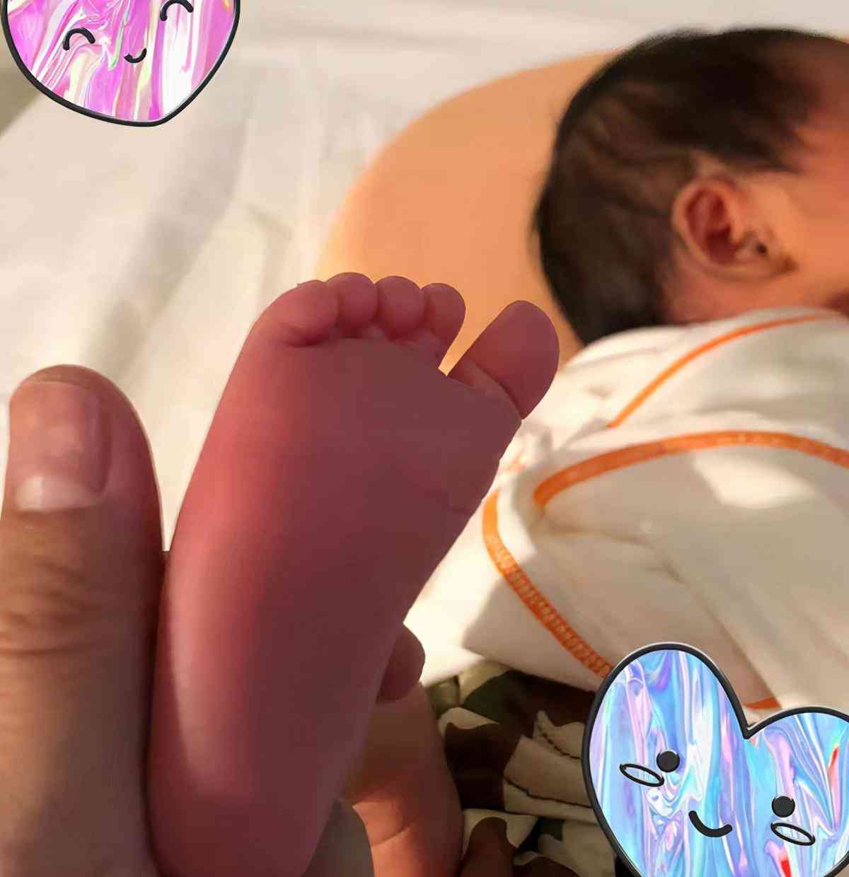 另一張照片中,林依晨的愛女正在床上呼呼大睡,飽滿的耳朵與媽媽如出一轍。作為新手媽媽的林依晨把孩子的小腳丫抬起來隨意玩弄,畫面溫馨。