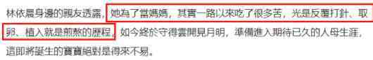 據(jù)知情人士透露,林依晨忍受過反復(fù)打針、取卵、植入等人工受孕過程。