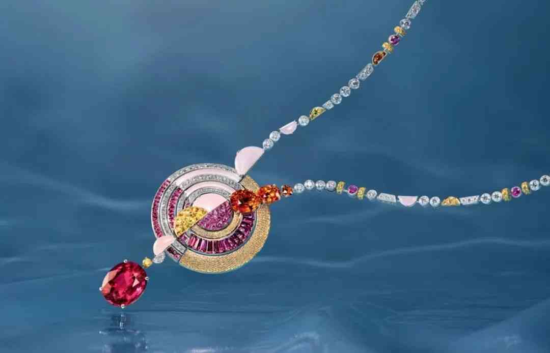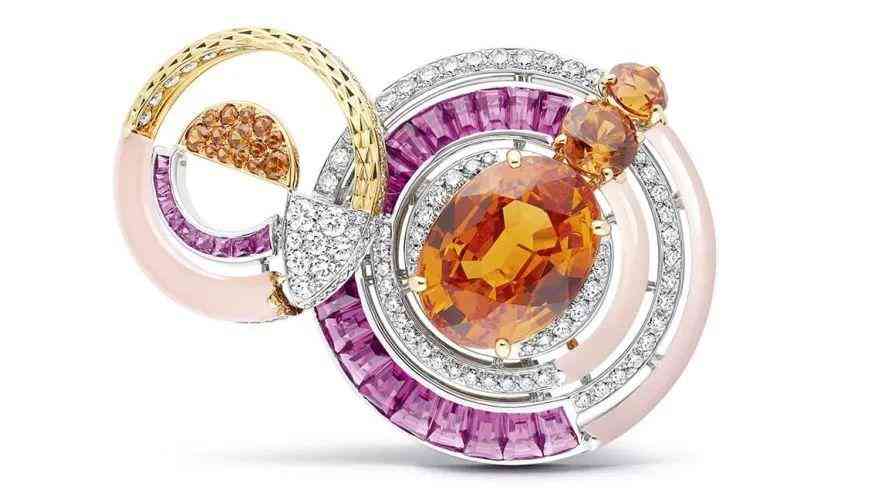 但今年有些不同,各大品牌可能都需要熱情的橙色來提振后疫情時代的士氣,對芬達石的應用可謂八仙過海各顯神通。尚美巴黎讓它展現(xiàn)大海上的熱情陽光,將芬達石和覆盆子色碧璽、粉色玉髓連接在一起,配上編織的金繩,鋪鑲的鉆石,展現(xiàn)出豐富細膩的肌理變化。