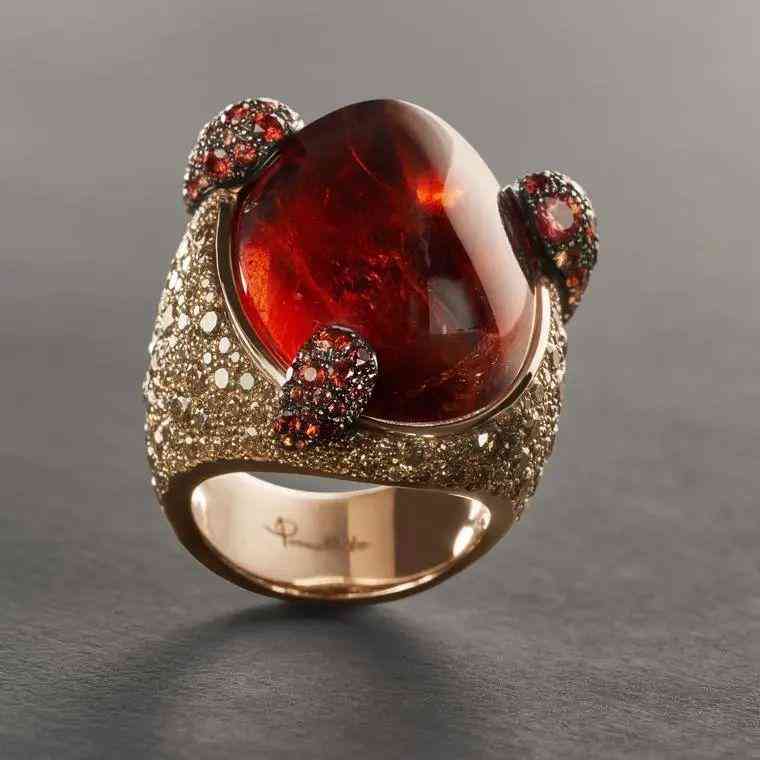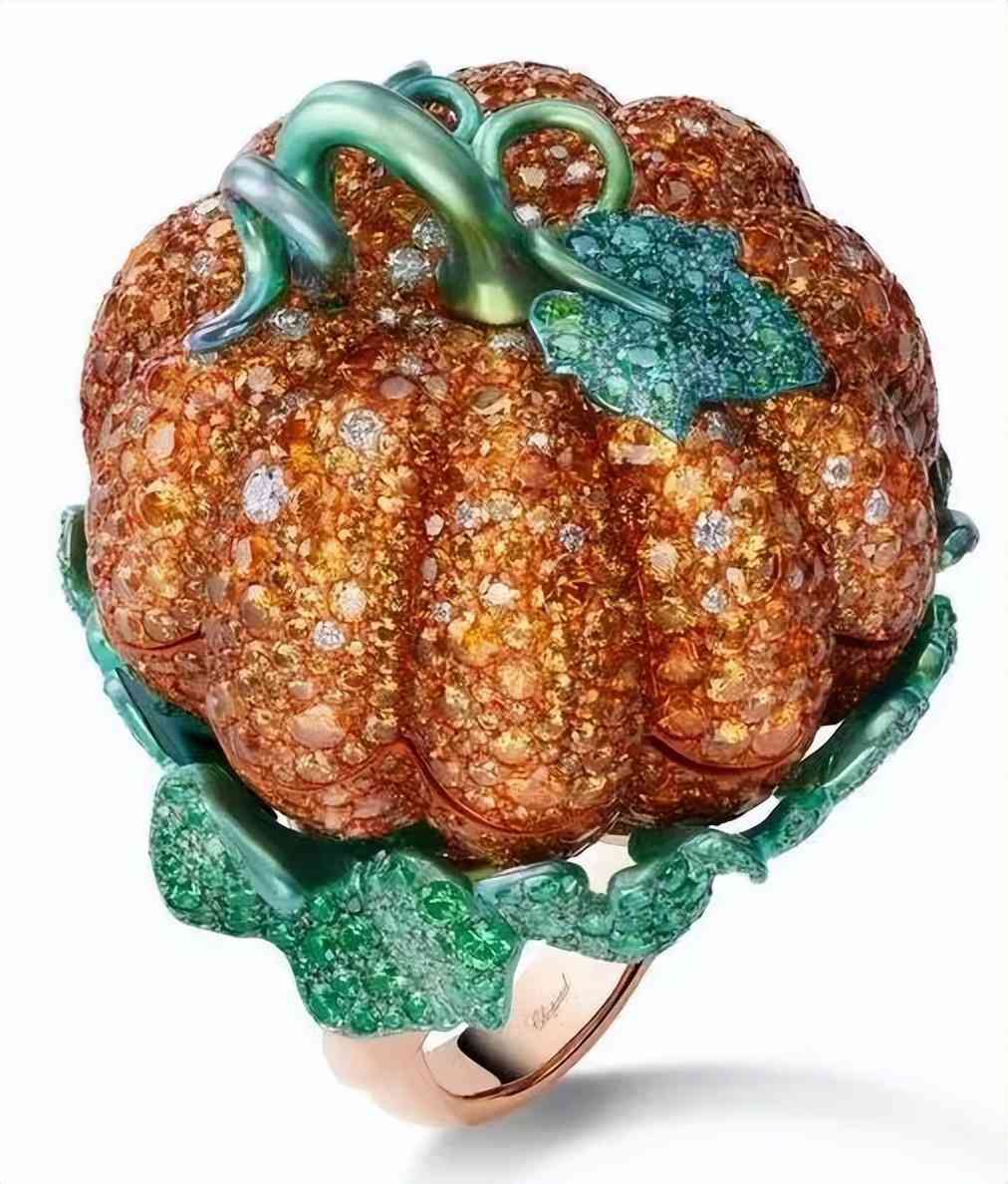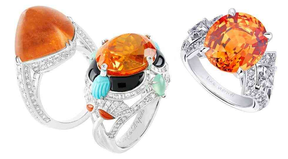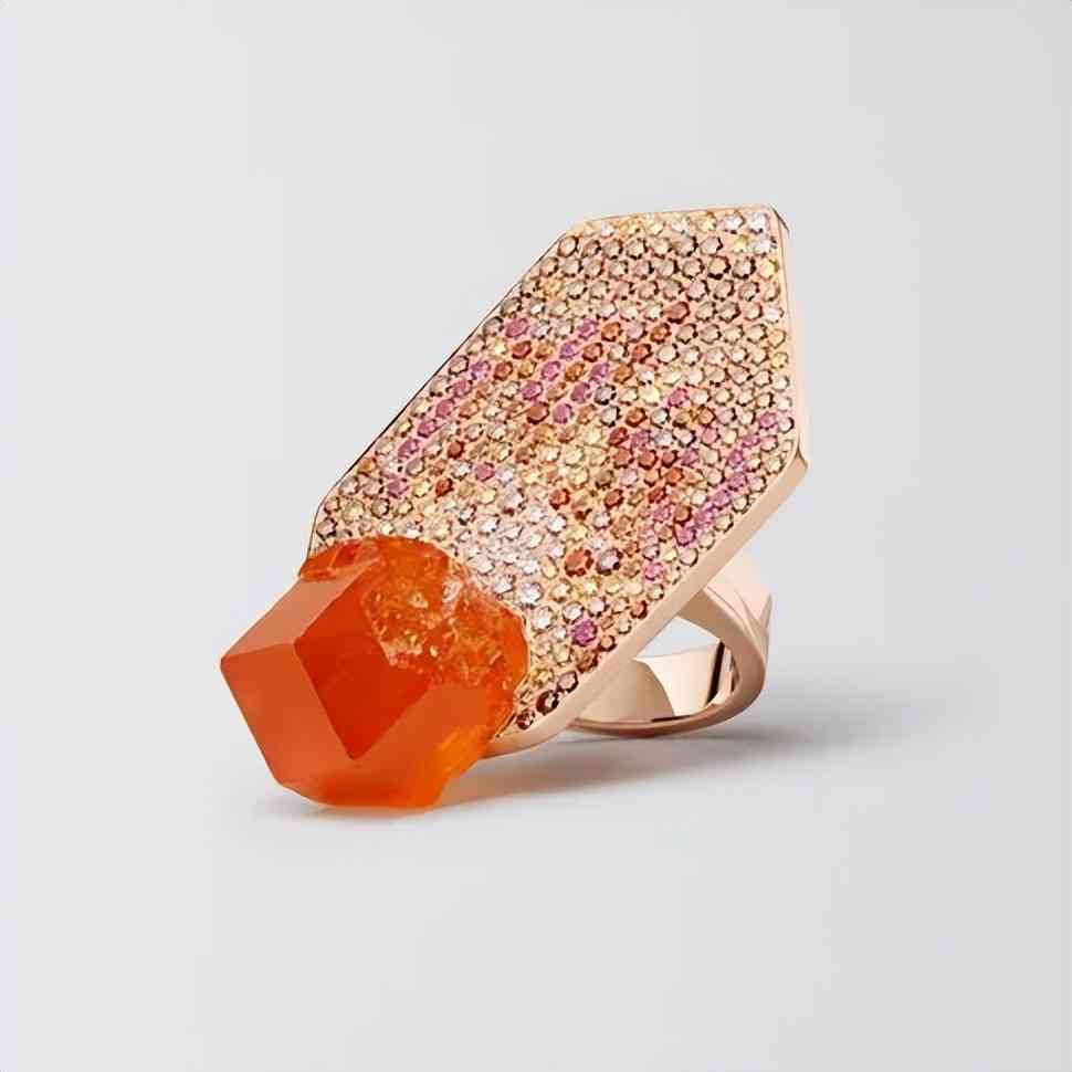 而且錳鋁榴石是沒法以人工手段增強色澤的,所以只要設計師找到一顆大克拉的寶石,就會忍不住以它為主石進行設計,因此以往的高珠作品中出現(xiàn)最多的就是芬達石戒指。