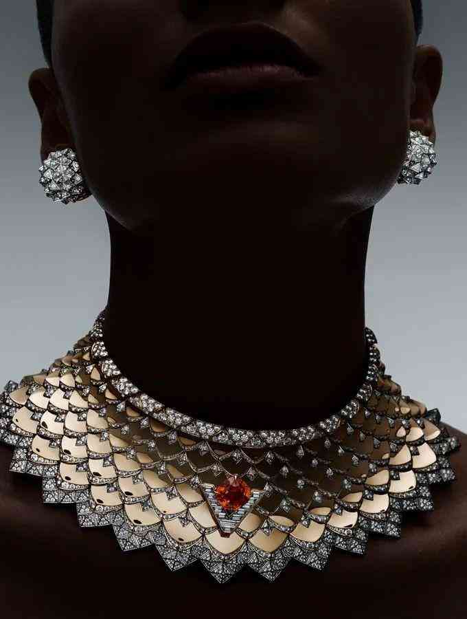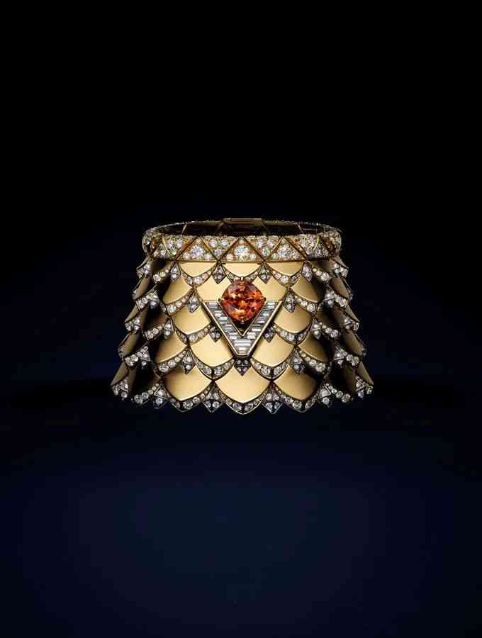 路易威登今年也收集到了大克拉的芬達石, Spirit 高級珠寶的 Radiance 項鏈設計猶如層疊的盔甲,黃金打造的鱗片讓人聯(lián)想到威武的巨龍, Francesca Amfitheatrof 將一顆 10.99 克拉的芬達石鑲嵌在項鏈正中,為英姿颯爽的女戰(zhàn)士點燃心中的熊熊火焰。