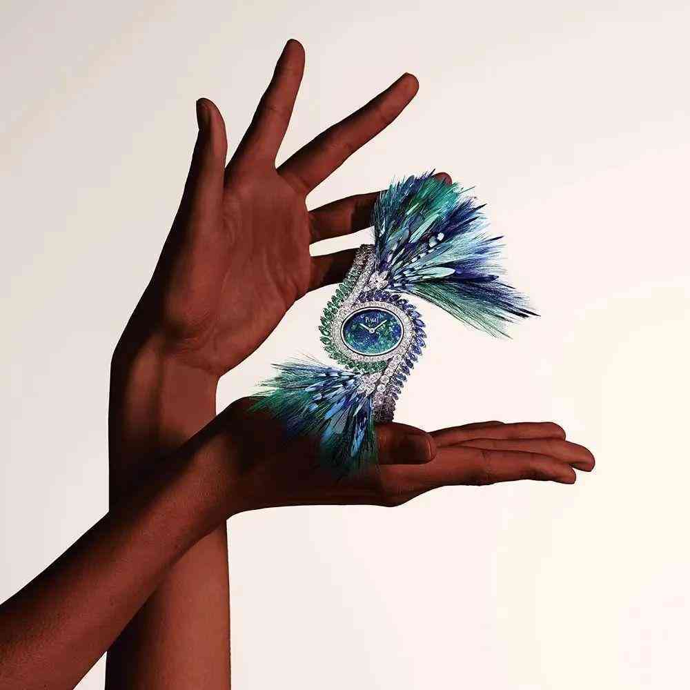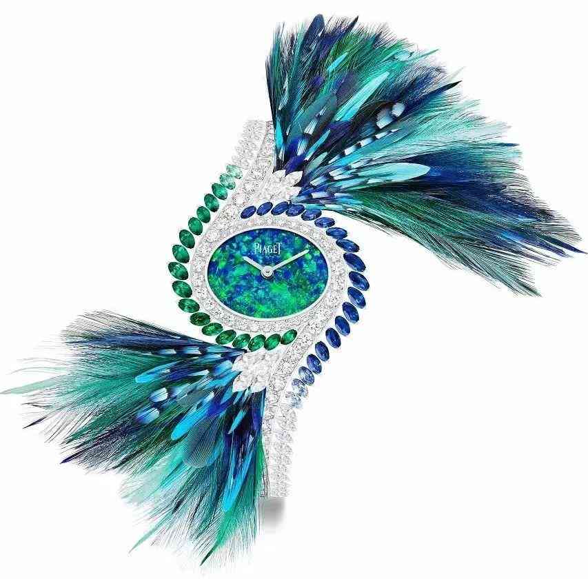 Piaget 伯爵 Extravagant Touch 高級珠寶腕表 白金、藍寶石、祖母綠、鉆石,黑歐泊、羽毛