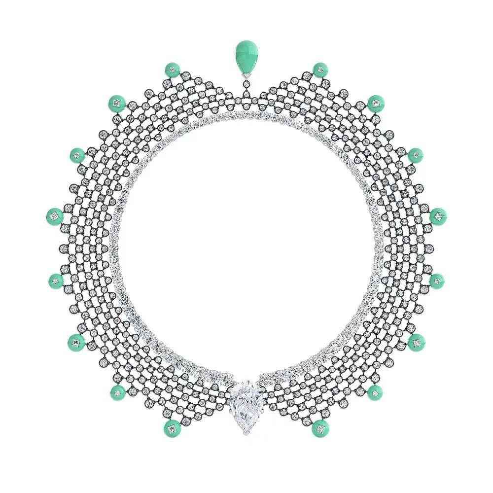 蕭邦今年整個 Red Carpet 高珠系列都以電影為靈感,這條鑲嵌著歐泊的項鏈則是致敬《阿凡達》之作,猶如萬花筒般的歐泊鑲嵌在綠松石和帕拉伊巴碧璽構(gòu)成的框架之中,并懸掛在祖母綠珠子上,形神兼?zhèn)涞卣宫F(xiàn)了勃勃生機的潘多拉星球。