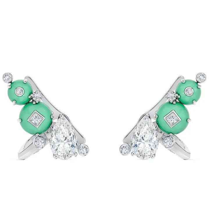 De Beers Jewellers 今年的高珠讓人耳目一新,采用了很多現(xiàn)代主義風格的設計,這讓他們帶來的綠玉髓珠寶格外與眾不同。和以往綠玉髓總是做配角不同,這次的 Midnight Aura (午夜極光)套裝讓綠玉髓成為了主角之一,和鉆石組 CP,但在白金和鉆石的烘托下,代表著極光的綠玉髓格外引人注目。