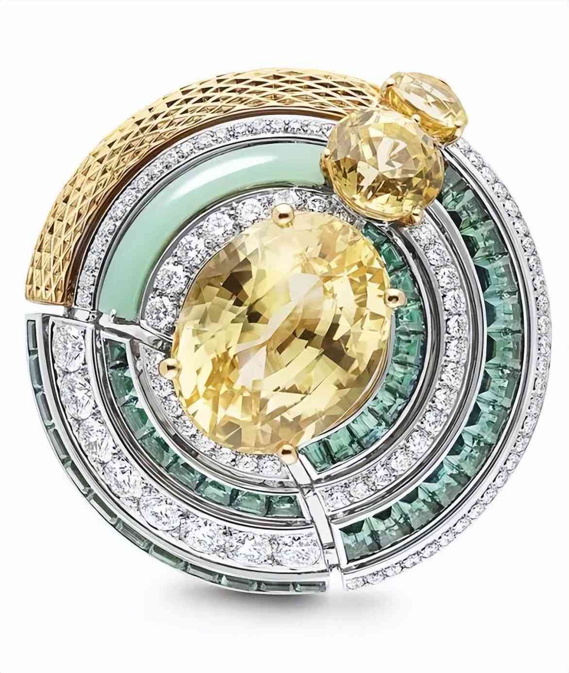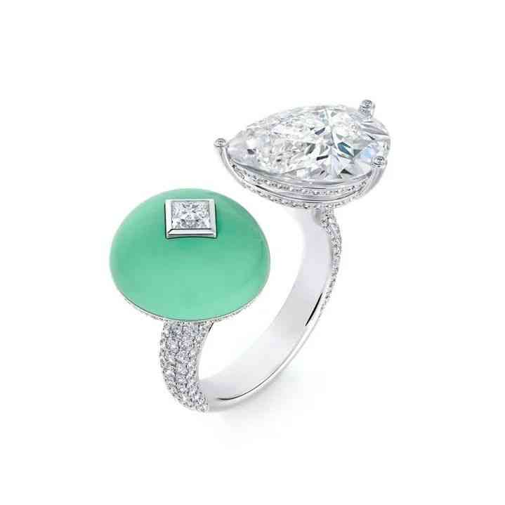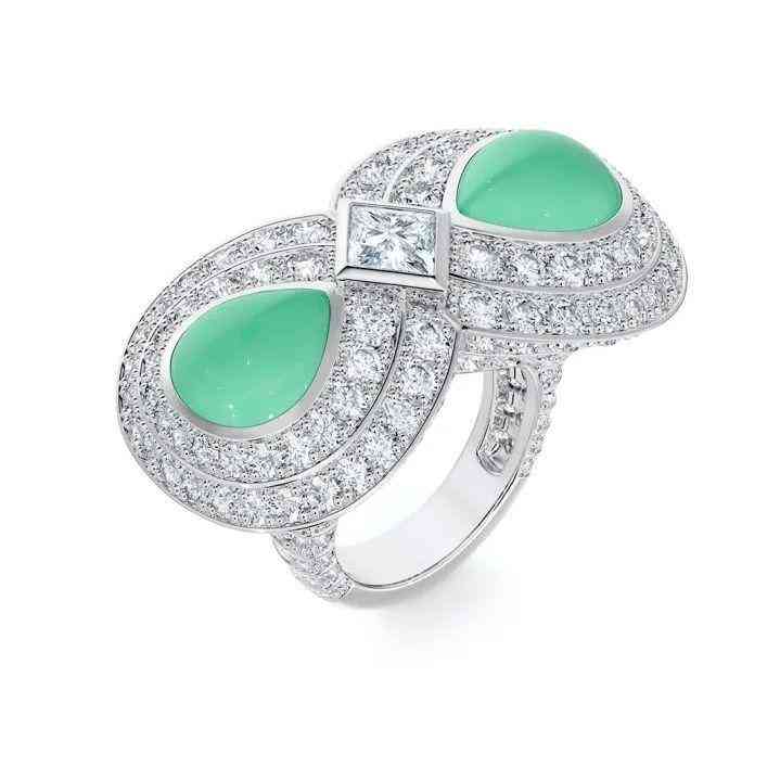 尚美巴黎今年的高珠也選擇了玉髓,他們用淡雅的綠玉髓搭配同色系的碧璽,再用黃鉆和白鉆提亮,整枚戒指變化豐富細膩,而那一抹沉穩(wěn)的玉髓剛好為寶石的璀璨畫上一抹留白。