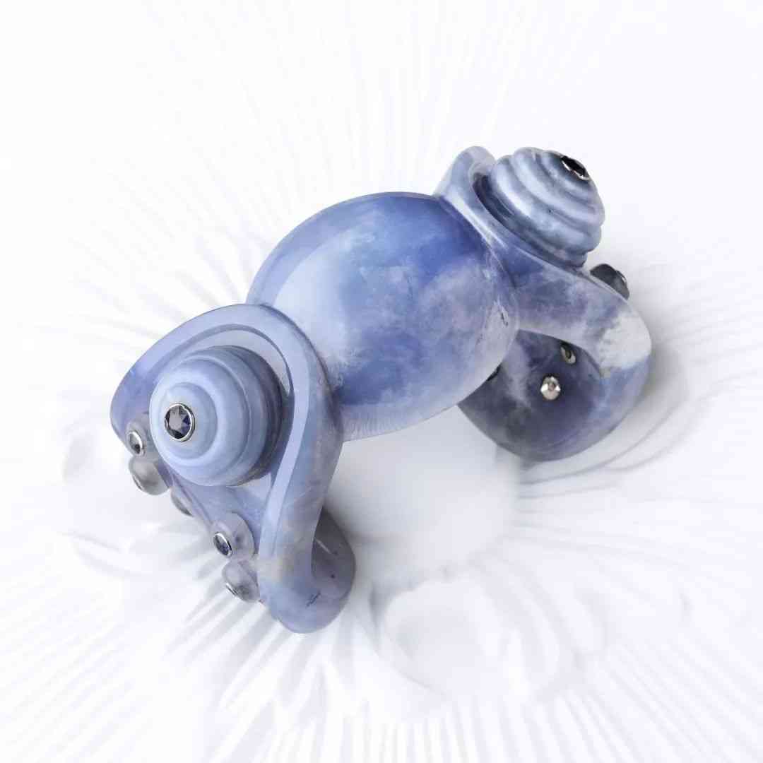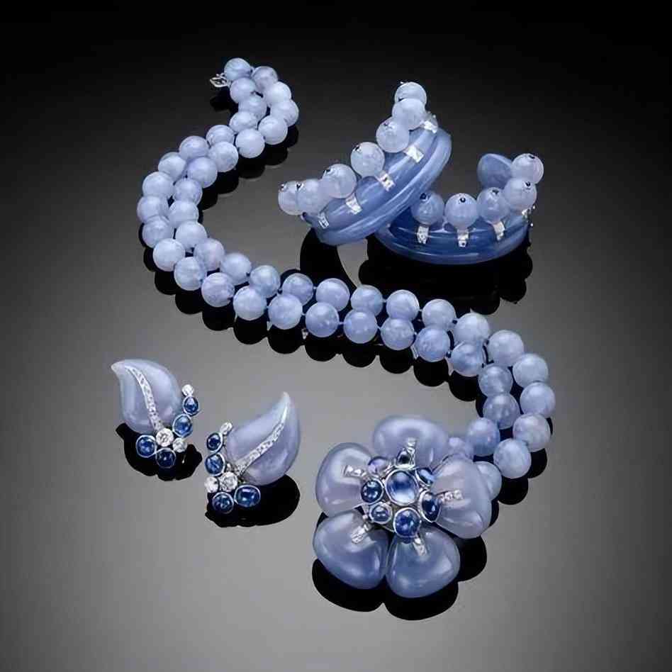 玉髓(Chalcedony)雖然看起來“溫潤如玉”,但實際上和玉石沒啥關系,它是一種隱晶質(zhì)石英,和瑪瑙是一家子。玉髓最特別的就是它柔和的顏色和光澤,有的呈蠟質(zhì)光澤,有的則呈半透明的朦朧感。顏色很多,在珠寶中常見的有紅、綠、紫、藍,而在高珠中應用最多的就是藍色、綠色和紫色,都是非常淡雅的高級灰色,讓它在眾多鮮艷奪目的彩色寶石中顯得頗為低調(diào),但卻能完美地彼此襯托,展現(xiàn)出不同的氣質(zhì)。