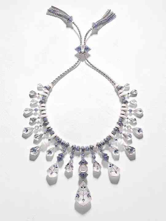 卡地亞一直都非常擅長處理這些不透明、半透明的寶石,比如縞瑪瑙、翡翠、珊瑚……自然也很偏愛玉髓。去年的高珠系列中使用了紫玉髓,今年就選擇了藍玉髓。Rituel 項鏈由兩排藍玉髓柱子組成,與紅寶石、鉆石交相輝映,用縞瑪瑙巧妙勾勒,以特殊的配色向中美洲民族風致敬。由于采用了隱形鑲嵌技術,這些圖案在鉆石錐體和多面紅寶石之間交替出現(xiàn),仿佛懸浮在空中。