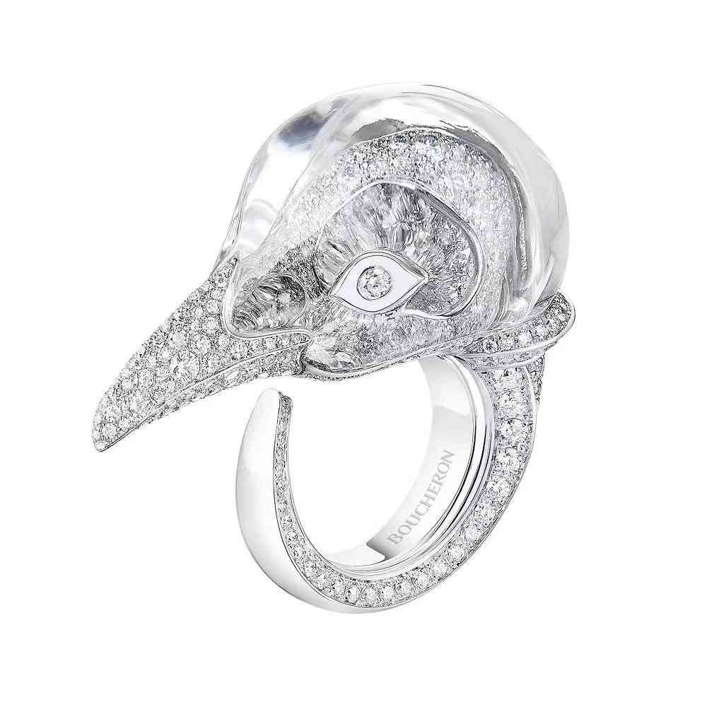 而今年的寶詩龍 Ailleurs 高珠系列則又帶來了水晶“新玩法”,Claire Choisne 設計的 Pie 戒指用水晶打磨出喜鵲頭部的透明罩,可以清晰地看到里面鑲嵌著鉆石的頭骨。