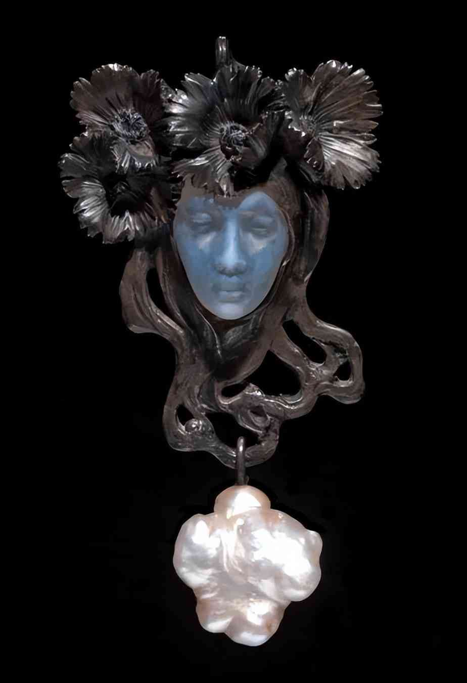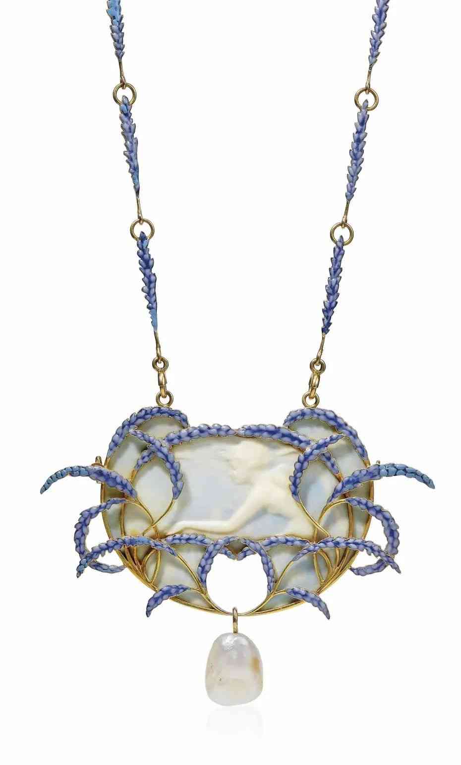 月光石的“高光”時期是上世紀初的新藝術運動時期,可以說是當仁不讓的“流量小生”,因為這種神秘冷光的朦朧效果和當時流行的半透明空窗琺瑯技藝簡直不要太搭。涌現(xiàn)了大量精巧唯美的珠寶杰作。