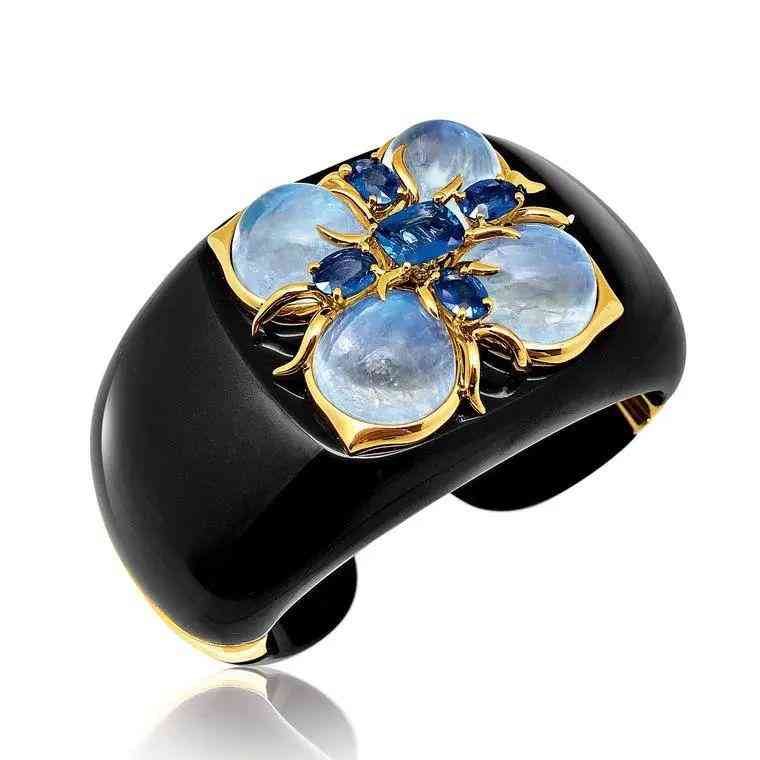 而當時和 Jean Schlumberger 齊名的另一位珠寶大師 Verdura 則也以月光石打造了自己簽名 Style 的 Dogwood cuff 手鐲,以半透明的月光石打造花瓣,以璀璨的藍寶石作為花蕊,鑲嵌在縞瑪瑙之上,肌理和色彩的變化層疊遞進,簡潔又大方。