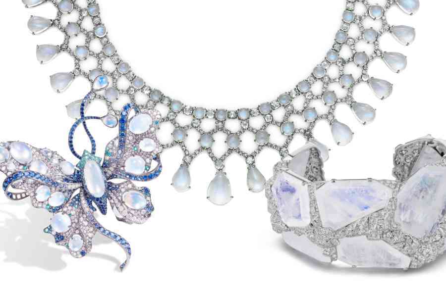 月光石也是相當小眾的寶石,今年也出現(xiàn)在高珠系列中,這種天生朦朧的寶石,自帶“月光效應”——這是月光石獨特的光學效應,是指隨著月光石的轉(zhuǎn)動,某一角度會顯現(xiàn)出白色至藍色的浮光效果。月光石通常呈現(xiàn)半透明效果并帶有乳白色或銀白色光澤,而具有藍色光澤的月長石是最有價值的一種,但很少出現(xiàn)超過 15-20 克拉的寶石。